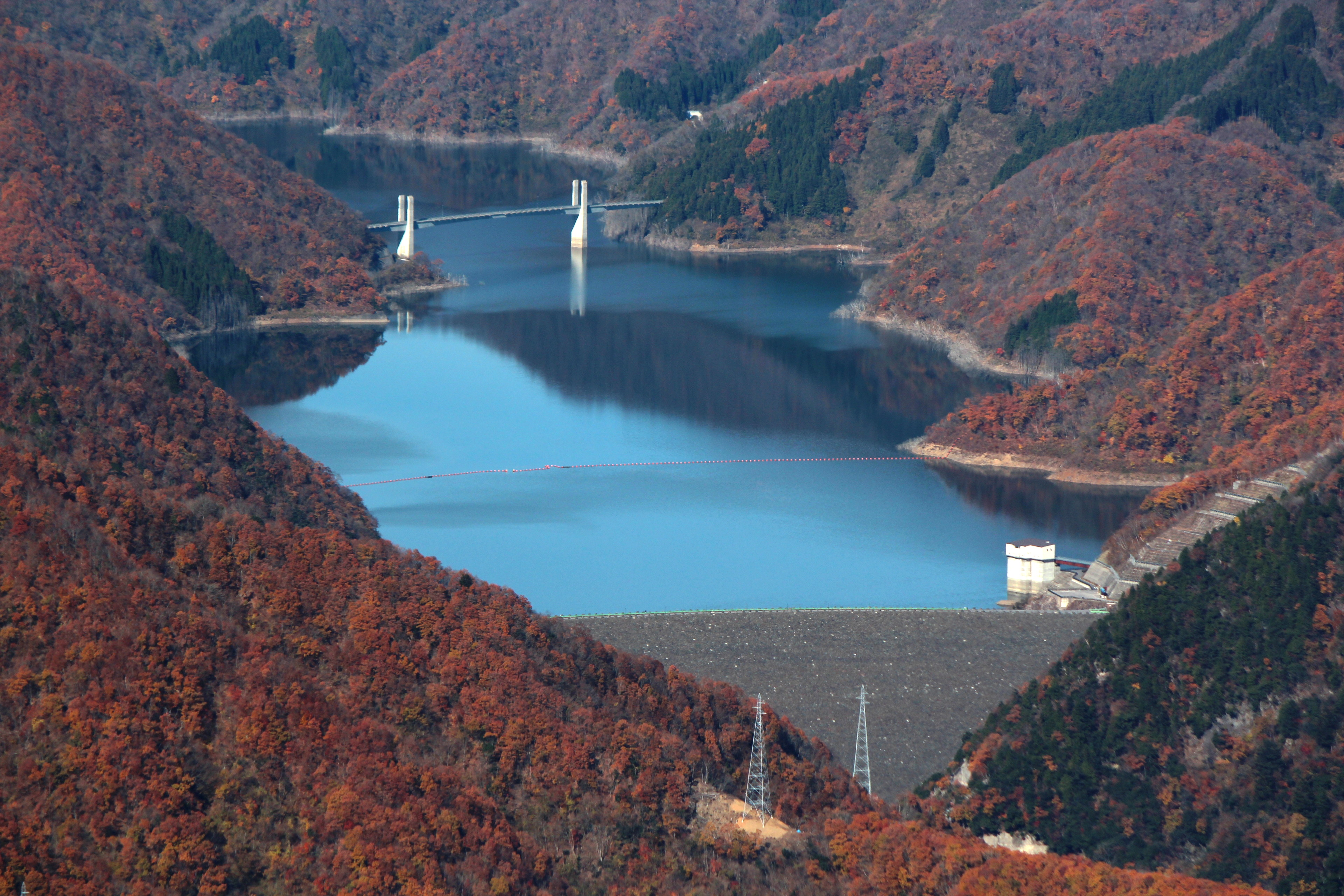 English: Tokuyama Dam and Tokunoyamahattoku Bridge seen from Mount Hanabusa in Ibigawa, Gifu prefecture, Japan. (Japanese) |