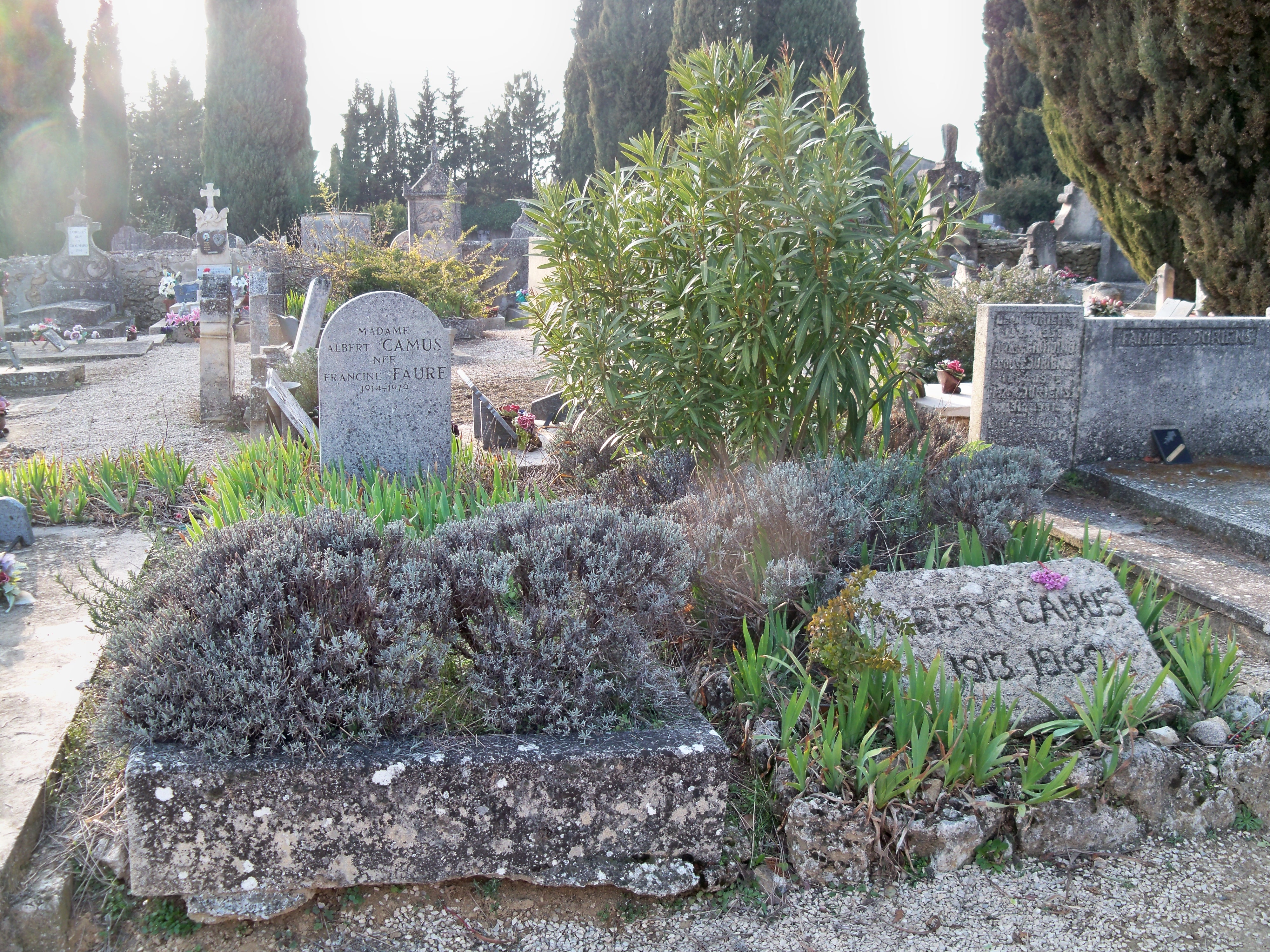 Français : Tombes d'Albert Camus et de Francine Faure, sa deuxième épouse, au cimetière de Lourmarin (France). English: Graves of Albert Camus and Francine Faure, his second wife, in the cemetery of Lourmarin (France). |