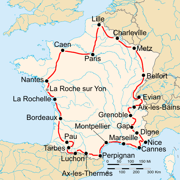 | Description | Route of the 1934 Tour de France, starting and finishing in Paris. The black dots are the cities that hosted a stage start and finish, the grey dots are the cities where a split stage was split. |
