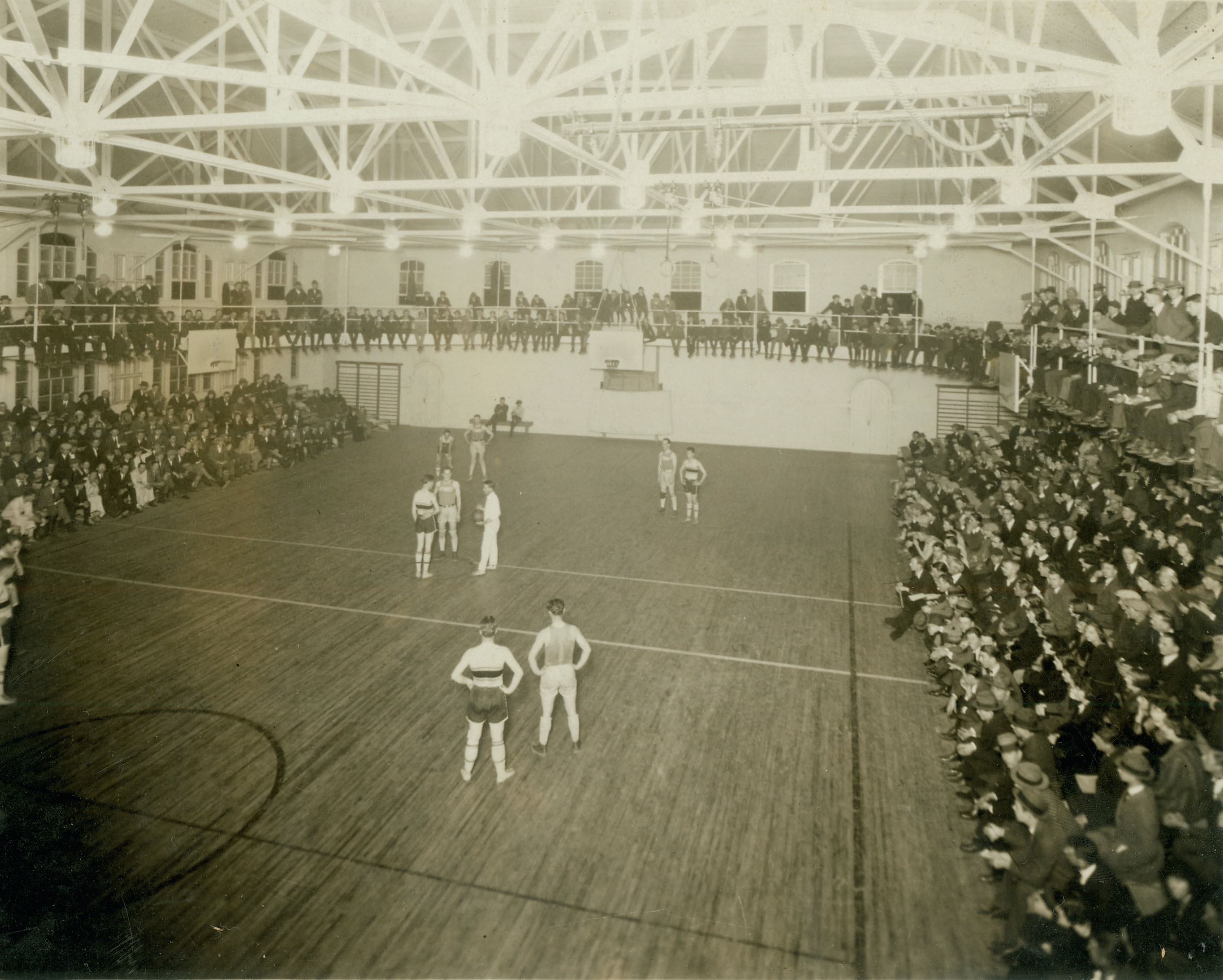 English: A basketball game between Trinity Blue and White and NC State Wolfpack at Duke's Alumni Memorial Gymnasium on January 28, 1924 |