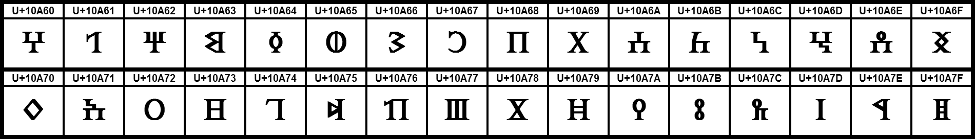 Deutsch: Grafiktafel für den Unicodeblock Altsüdarabisch. |