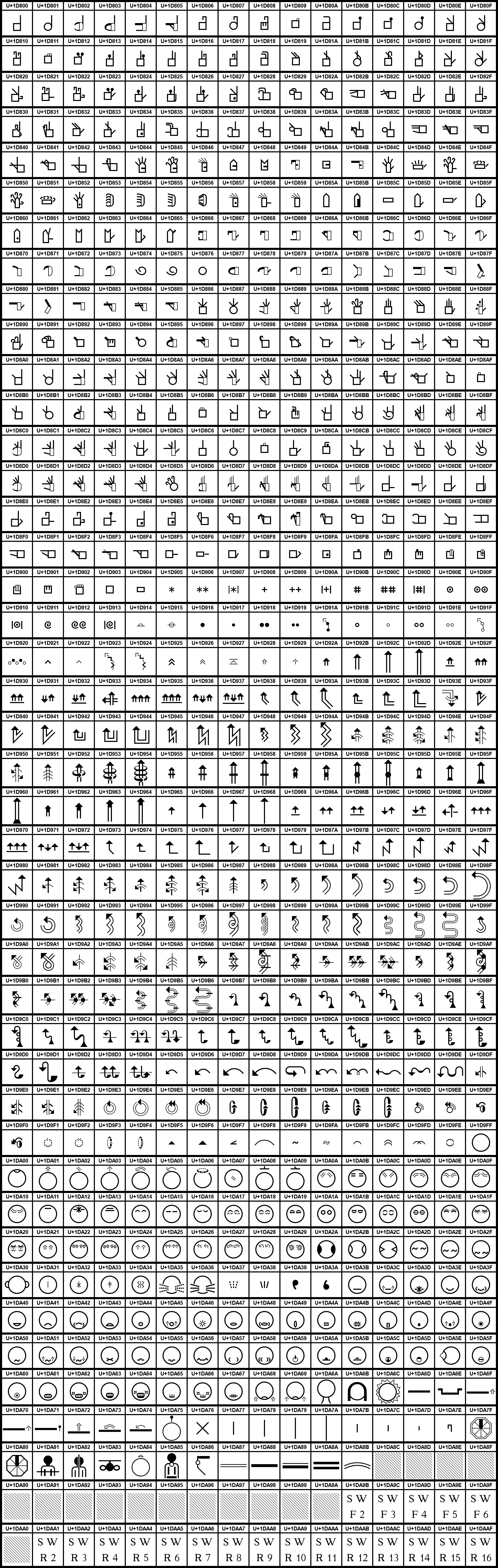 Deutsch: Grafiktafel für den Unicodeblock Sutton-Zeichensprache. Schraffierte Felder sind unbsetzte Codepoints |
