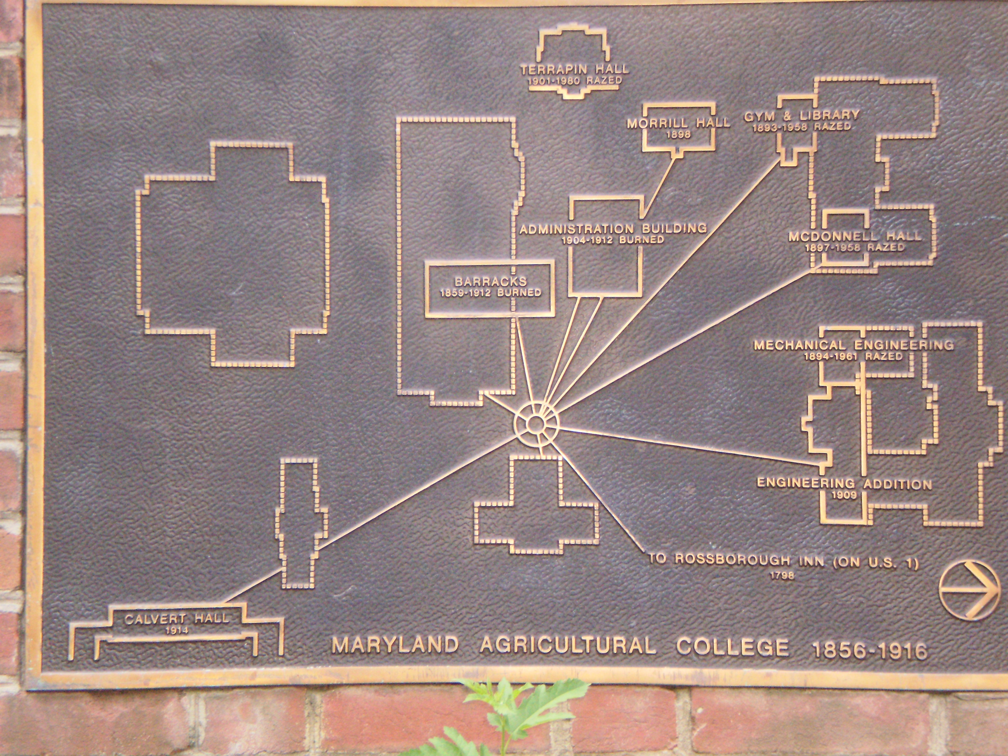English: Plaque showcasing the original campus of the University of Maryland, College Park before the Great Fire of 1912. |