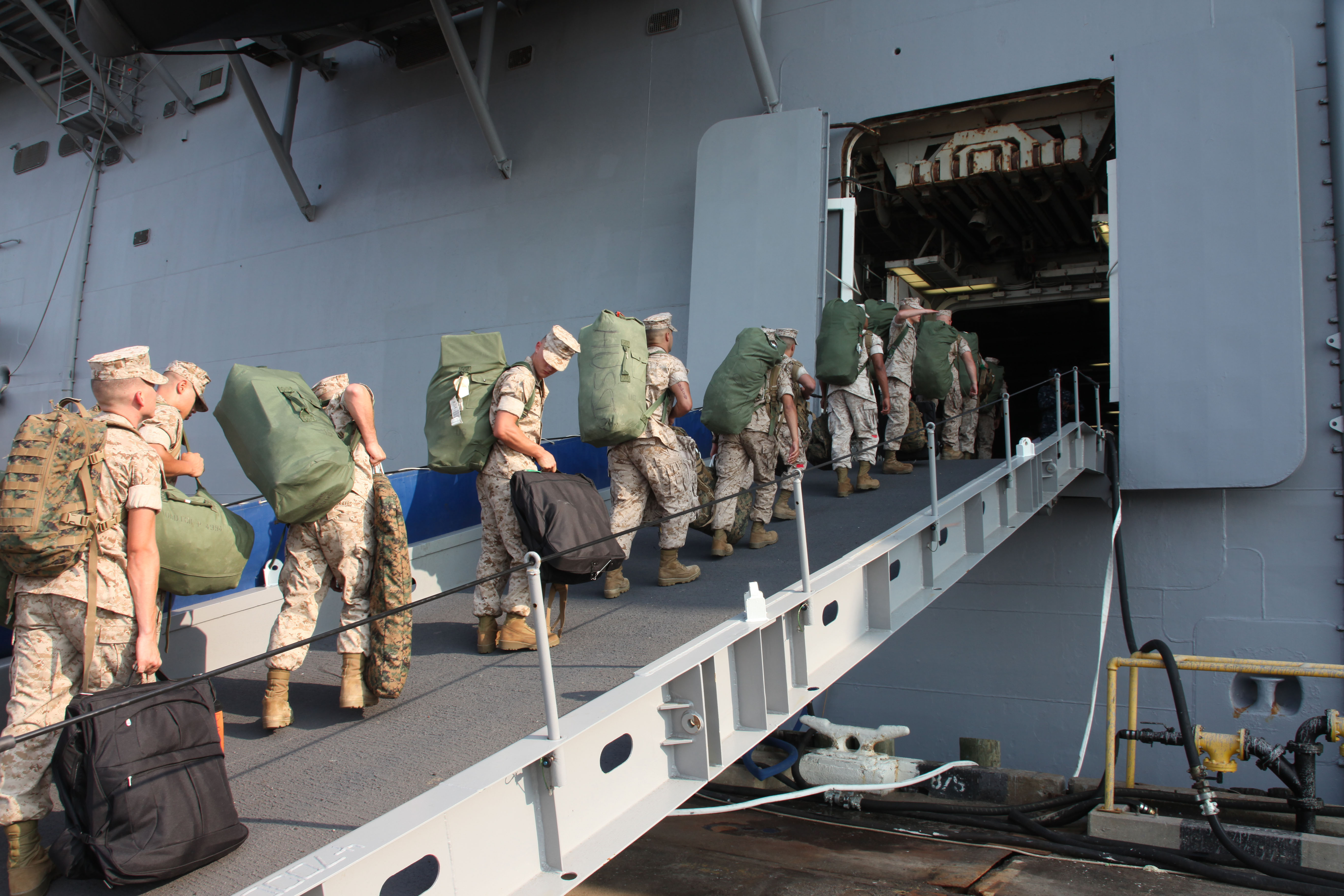 English: Marines and Sailors with the 24th Marine Expeditionary Unit board the USS Iwo Jima (LHD-7) at Pier 10, May 22, 2011. The Marines and Sailors on the ship are preparing to travel to participate in New York City's Fleet Week. Various units from II Marine Expeditionary Force and Marines Forces Reserve have organized under the 24th MEU to form the Special Purpose Marine Air Ground Task Force - New York. The Marines are embarking on the Navy’s Amphibious Assault Ships, the USS Iwo Jima (LHD -7) and USS New York (LPD-21) to take part in New York City's Fleet Week from May 25 to June 1, 2011. There, the Marines will showcase the capabilities of the MAGTF, and also honor those who have served by participating in a various of events during the Memorial Day weekend. |