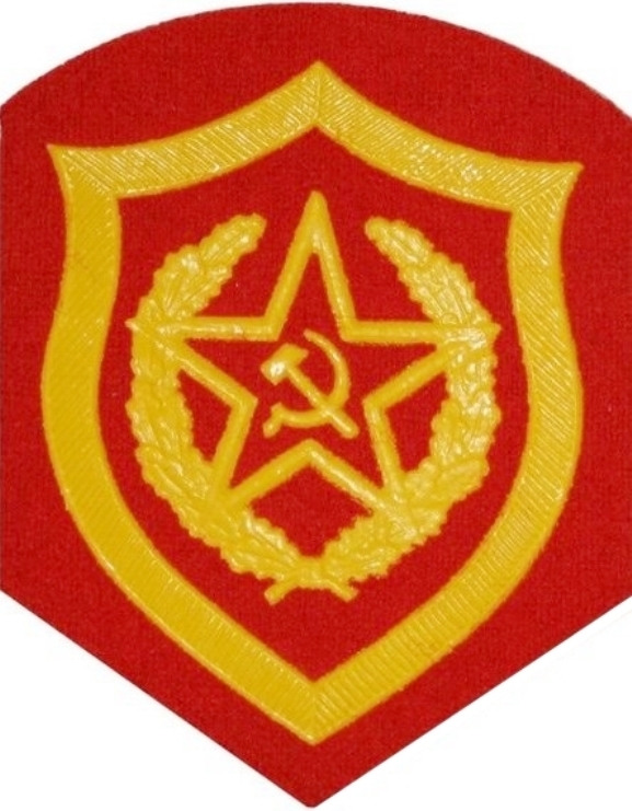 Deutsch: Emblem der sowjetischen Streitkräfte 1960 bis 1991, Sowjetische Armee (Teilstreitkräfte, Spezialtruppen oder Dienste), Aufnäher rechter Oberarm (Ausgangsuniform/ Paradeuniform) für die Ränge OR1 bis 8 sowie WO1 und 2, hier: – „Landstreitkräfte allgemein“ und „motorisierte Schützen, Ausführung 1985.