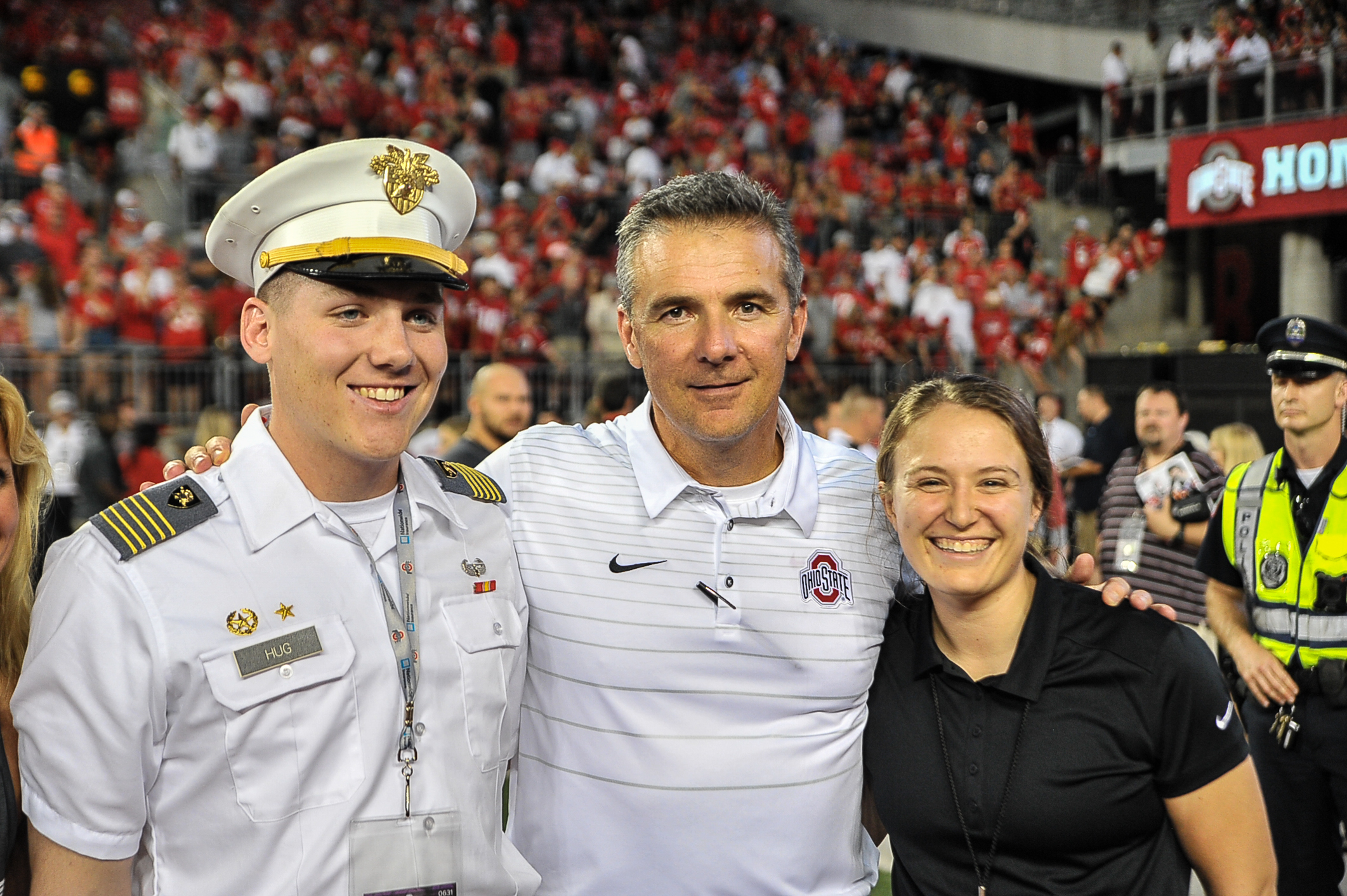 English: Urban Meyer with a couple of West Point Academy cadets after the Army-Ohio State game. |