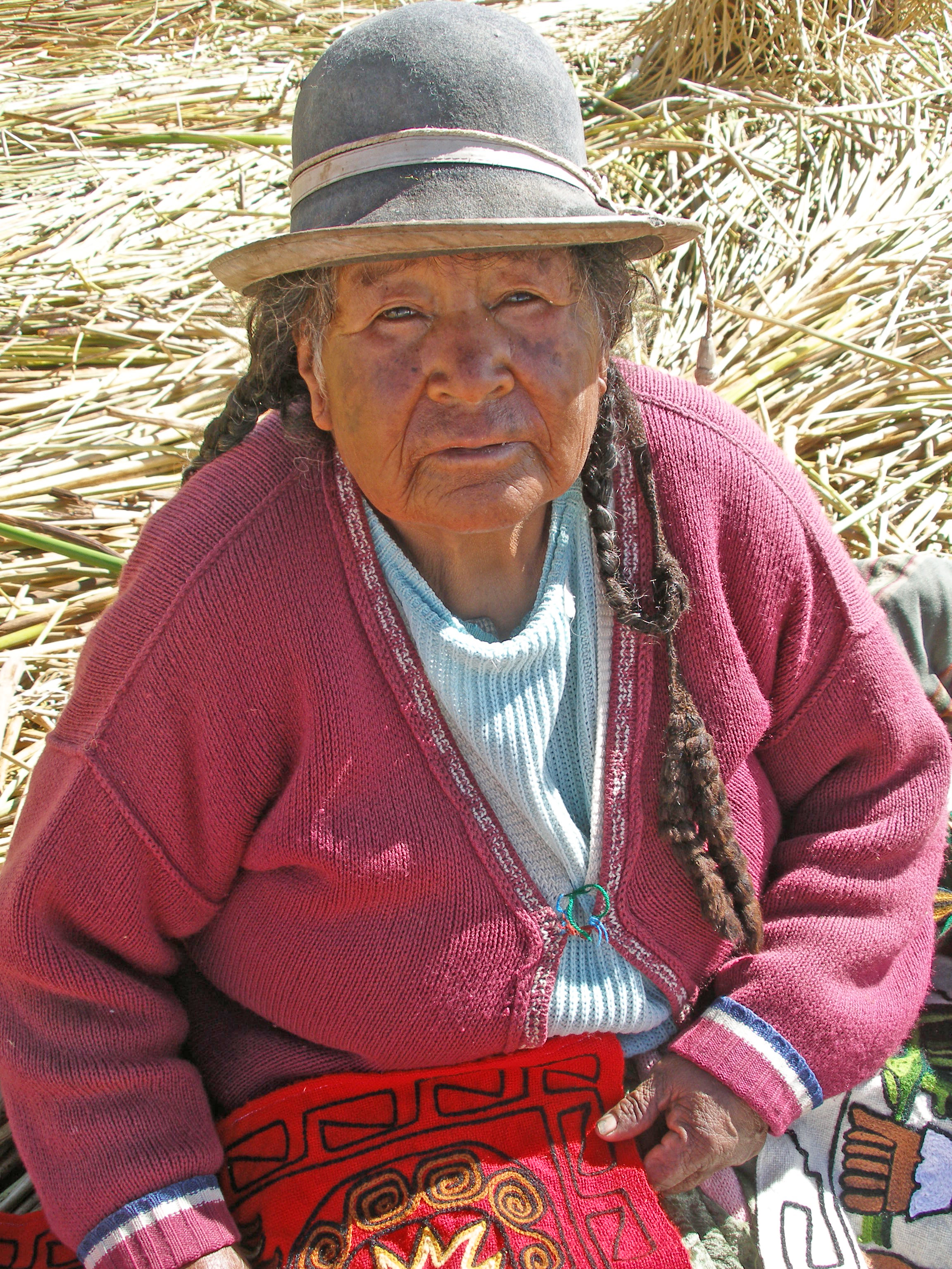 ملف:Uros Islands Lake Titicaca elderly woman.jpg
