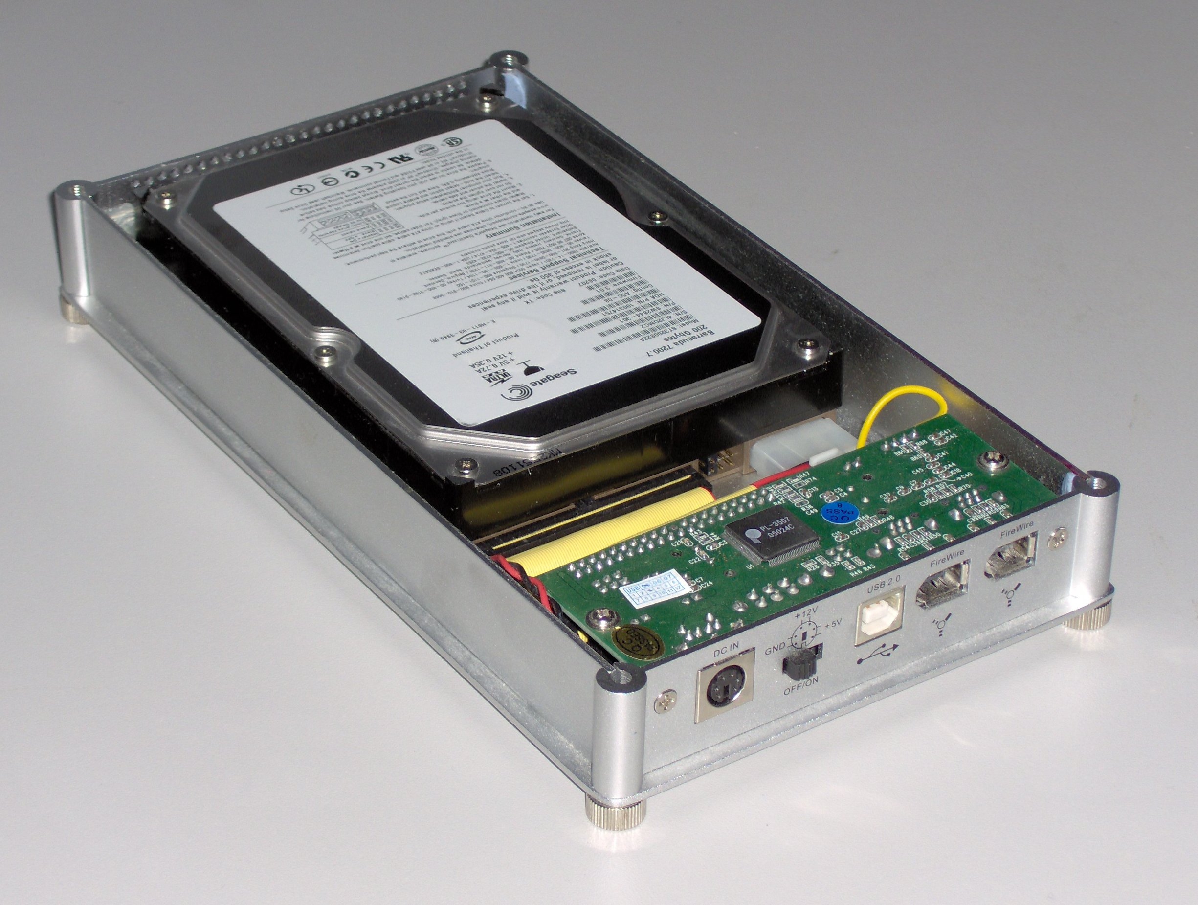 | Description | External hard disk enclosure from behind. On the back there is a power socket and switch, and USB and FireWire/IEEE1394 ports to connect to a computer. The cover has been removed to show the IDE hard disk inside, connected to the enclosure's disk controller via short ATA ribbon cable and a molex power connector. |