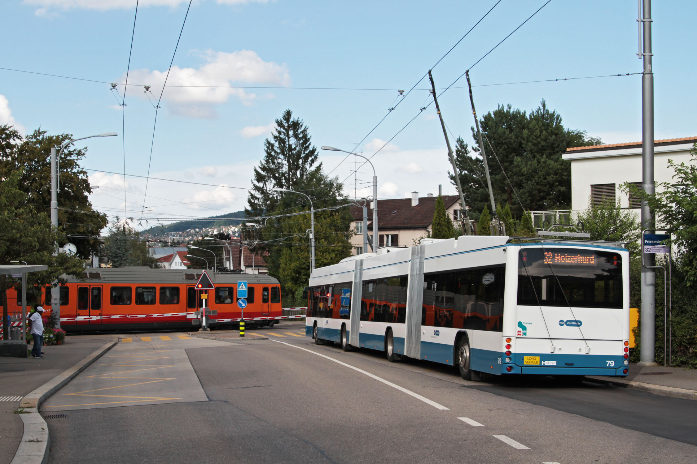 Deutsch: Hess/Vossloh-Kiepe lighTram Nr. 79 der Verkehrsbetriebe Zürich wartet vor dem Bahnübergang Friesenberg auf den Zug der Uetlibergbahn. Während das Trolleybusnetz mit 600 V Gleichstrom elektrifiziert ist, weist die Fahrleitung der Uetlibergbahn eine Spannung von 1200 V Gleichstrom auf. English: Verkehrsbetriebe Zürich's Hess/Vossloh-Kiepe lighTram No. 79 waits at the level crossing Friesenberg for the train of the Uetlibergbahn. While the trolleybus network has a voltage of 600 V DC, the Uetlibergbahn uses a voltage of 1200 V DC. |