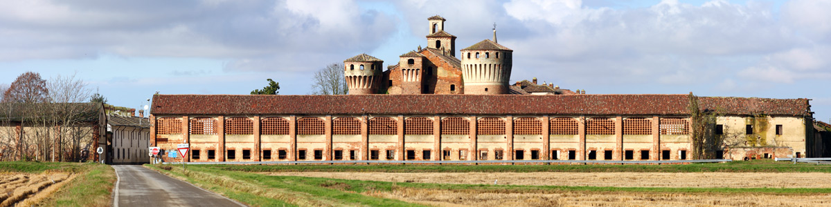 Italiano: Panorama di Valeggio (PV) provenendo da Scaldasole, con il cascinale che racchiude il castello |