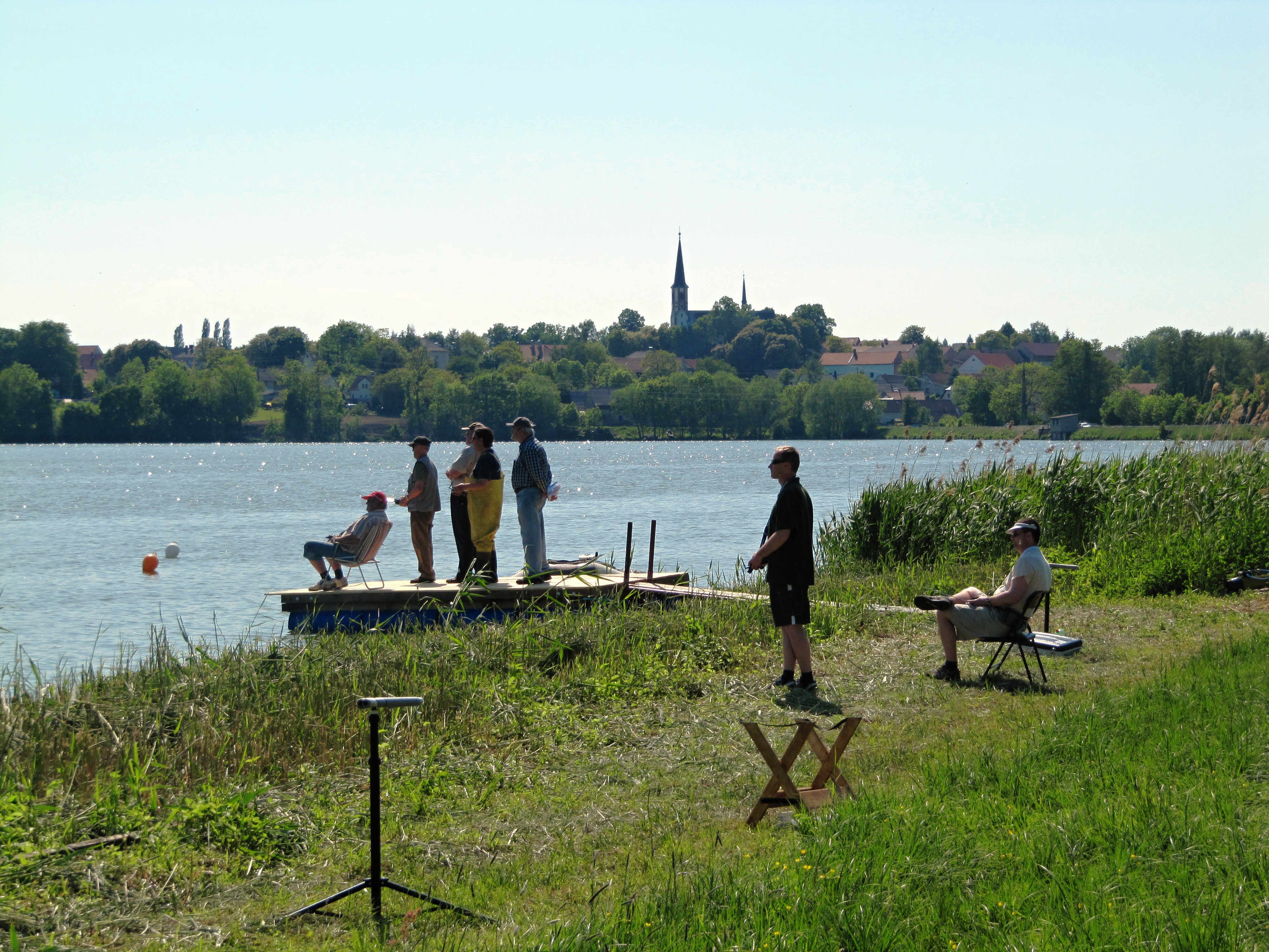 Deutsch: Vavřinec, Kreis Kutná Hora, Tschechien. Teich Vavřinecký rybník, im Hintergrund Turm der Laurentiuskirche.