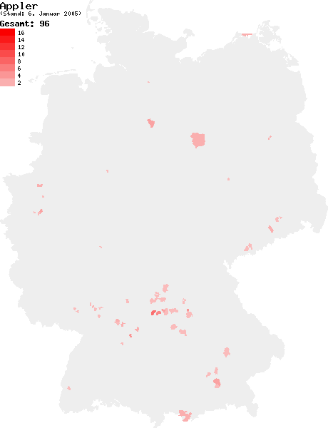 Deutsch: Verteilung des Nachnamens Appler in Deutschland nach dem Telefonbuch mit Stand vom 6. Januar 2005 |