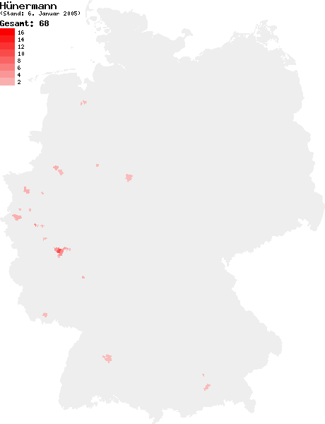 Deutsch: Verteilung des Nachnamens Hünermann in Deutschland nach dem Telefonbuch mit Stand vom 6. Januar 2005 |