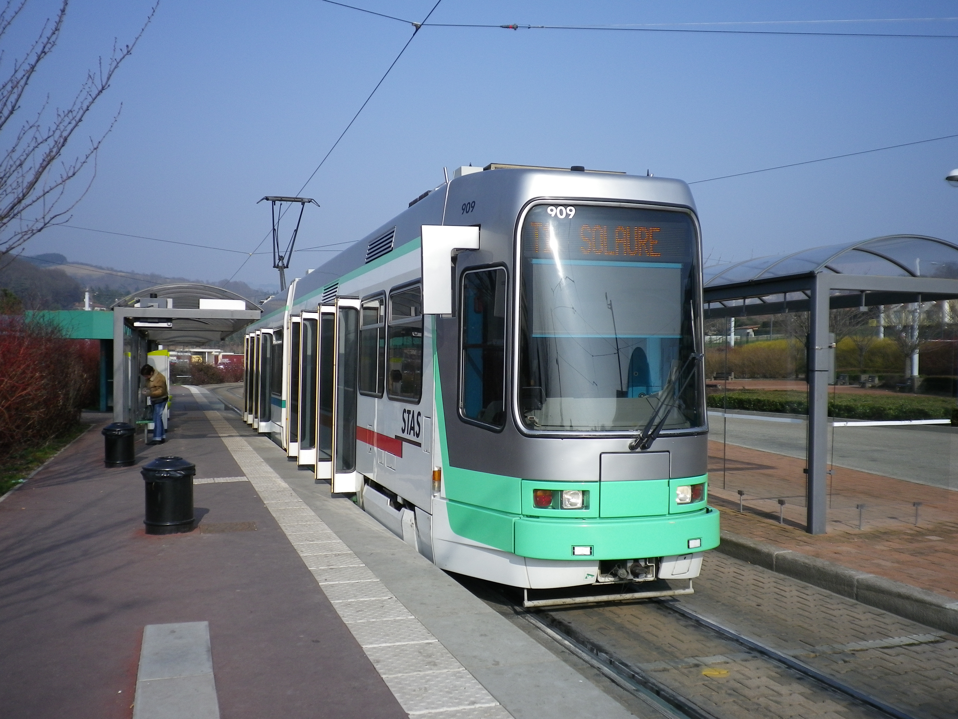 Français : Vevey-Alsthom - Rame 909 du réseau STAS - Saint-Etienne. Photo prise au terminus de la ligne T1, Hôpital Nord. قالب:Taken with |