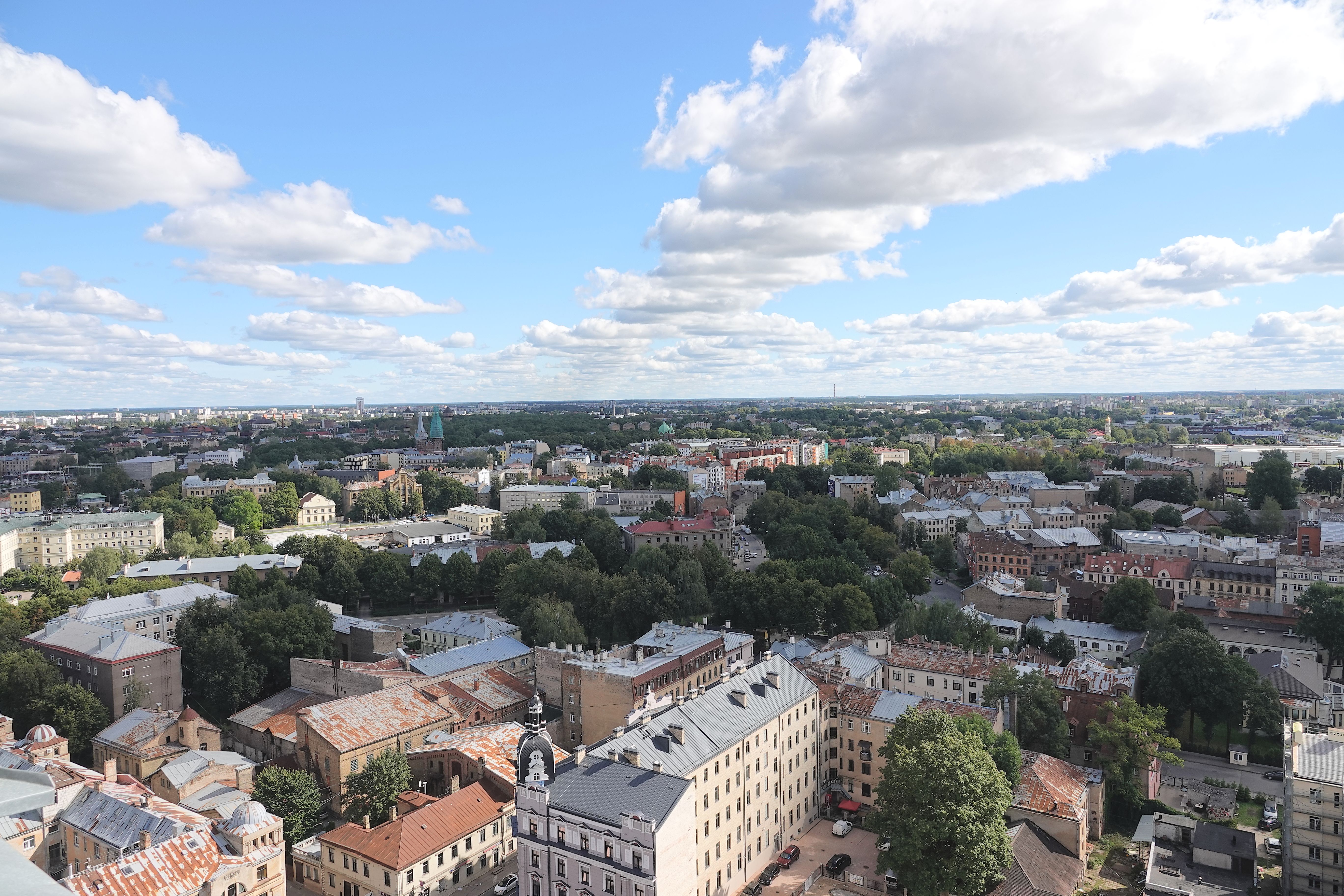 English: View from the 17th-floor balcony (height of 65 metres, 213 ft) of the Latvian Academy of Sciences building. The building is located in Maskavas Forštate, a neighbourhood of the capital Riga. |