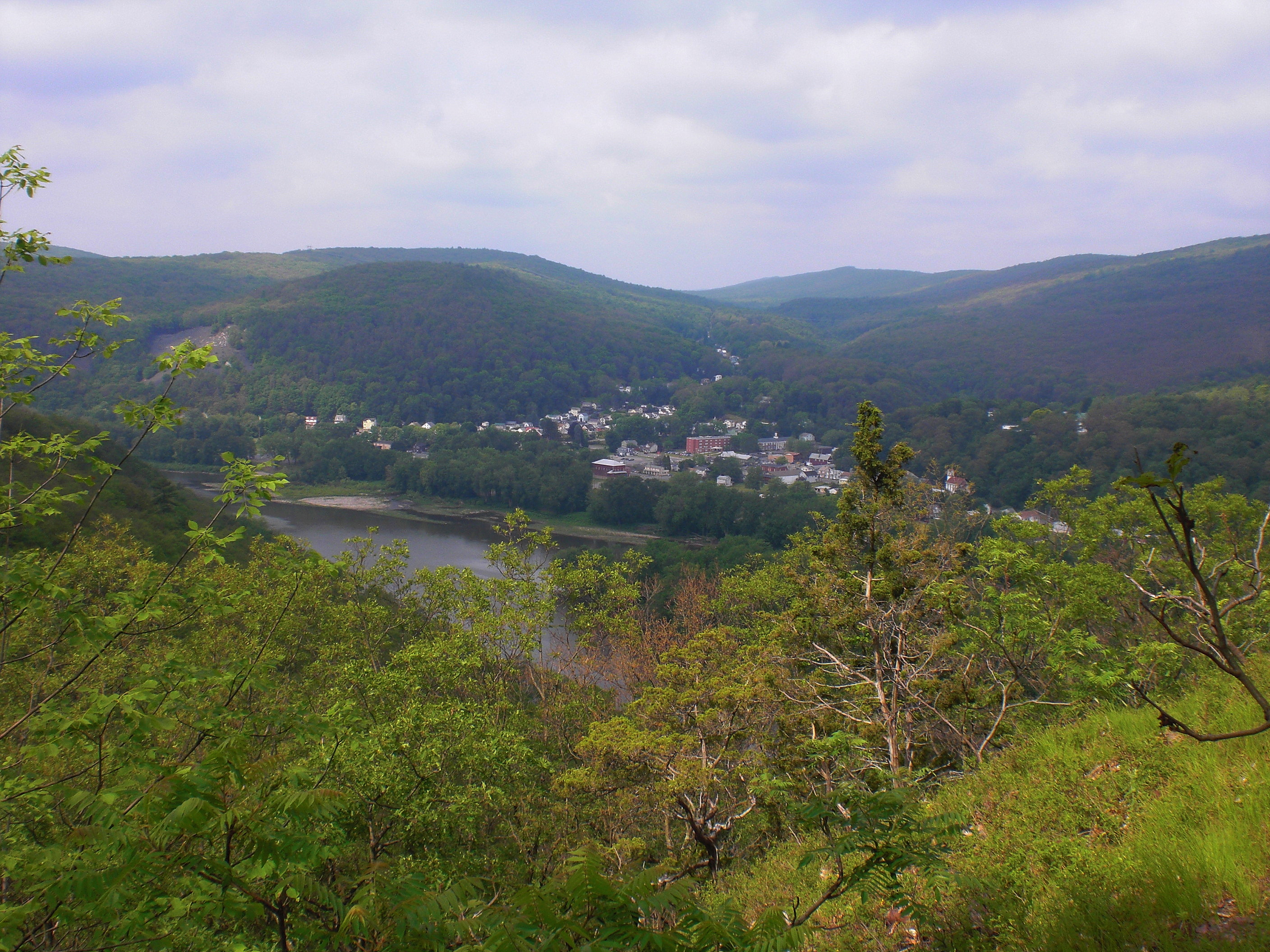 English: View of Shickshinny, Pennsylvania from Overlook B on the Mocanaqua Loop Trail. The Susquehanna River is in the foreground |