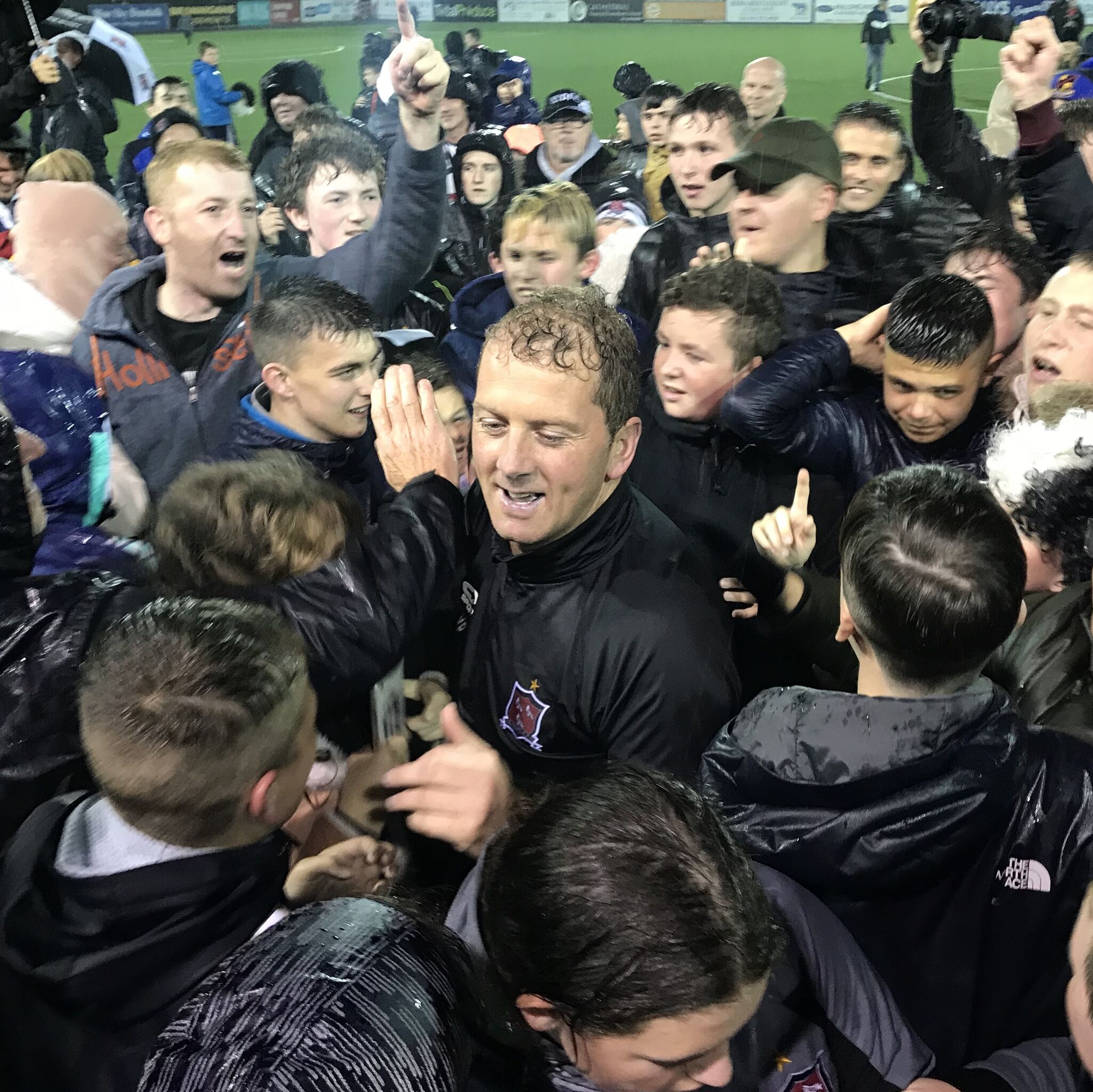 | Description | Dundalk F.C. manager, Vinny Perth, celebrates the club’s 2019 league title success with fans at Oriel Park. |