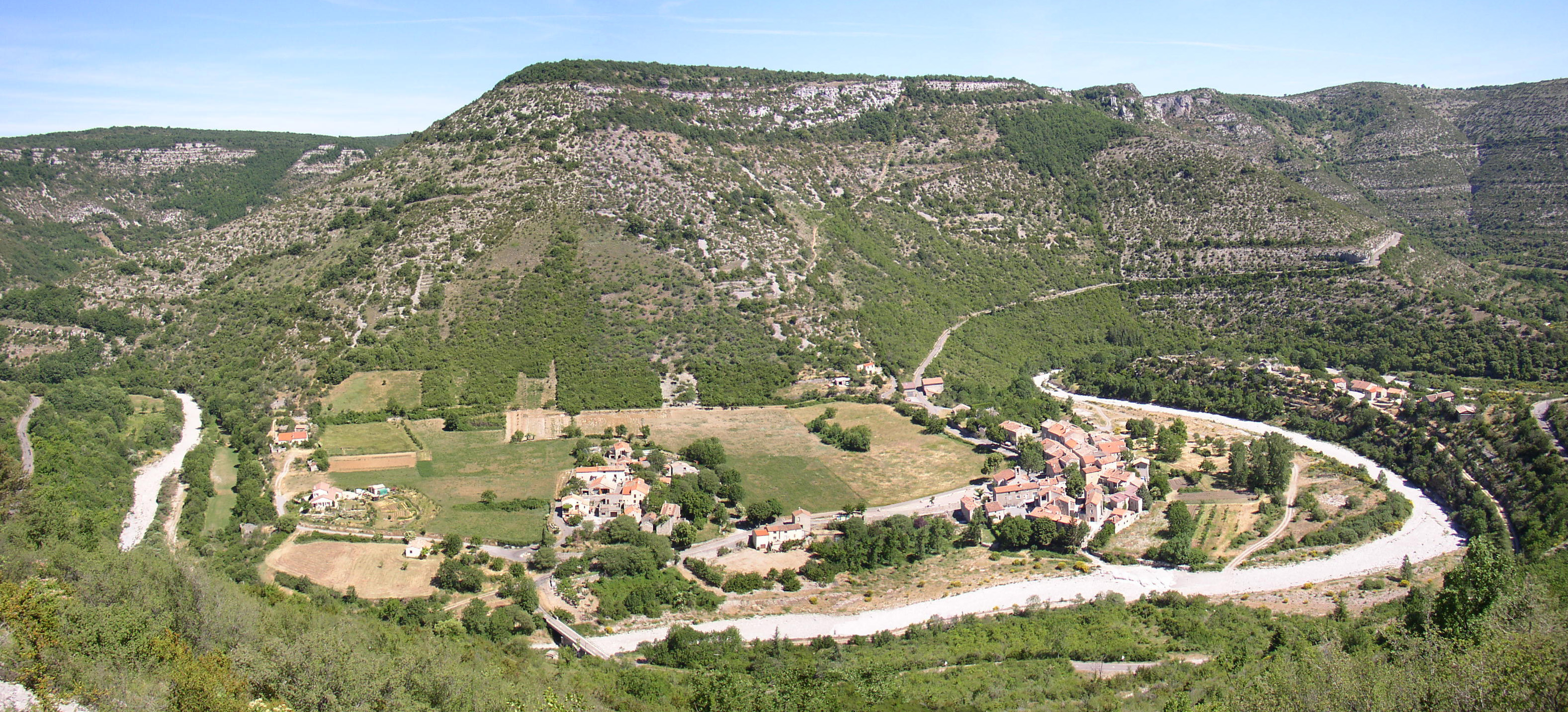 Français : Panoramique de Vissec, photomontage ; Le Cirque de Vissec, dans la vallée sèche de la Vis. |