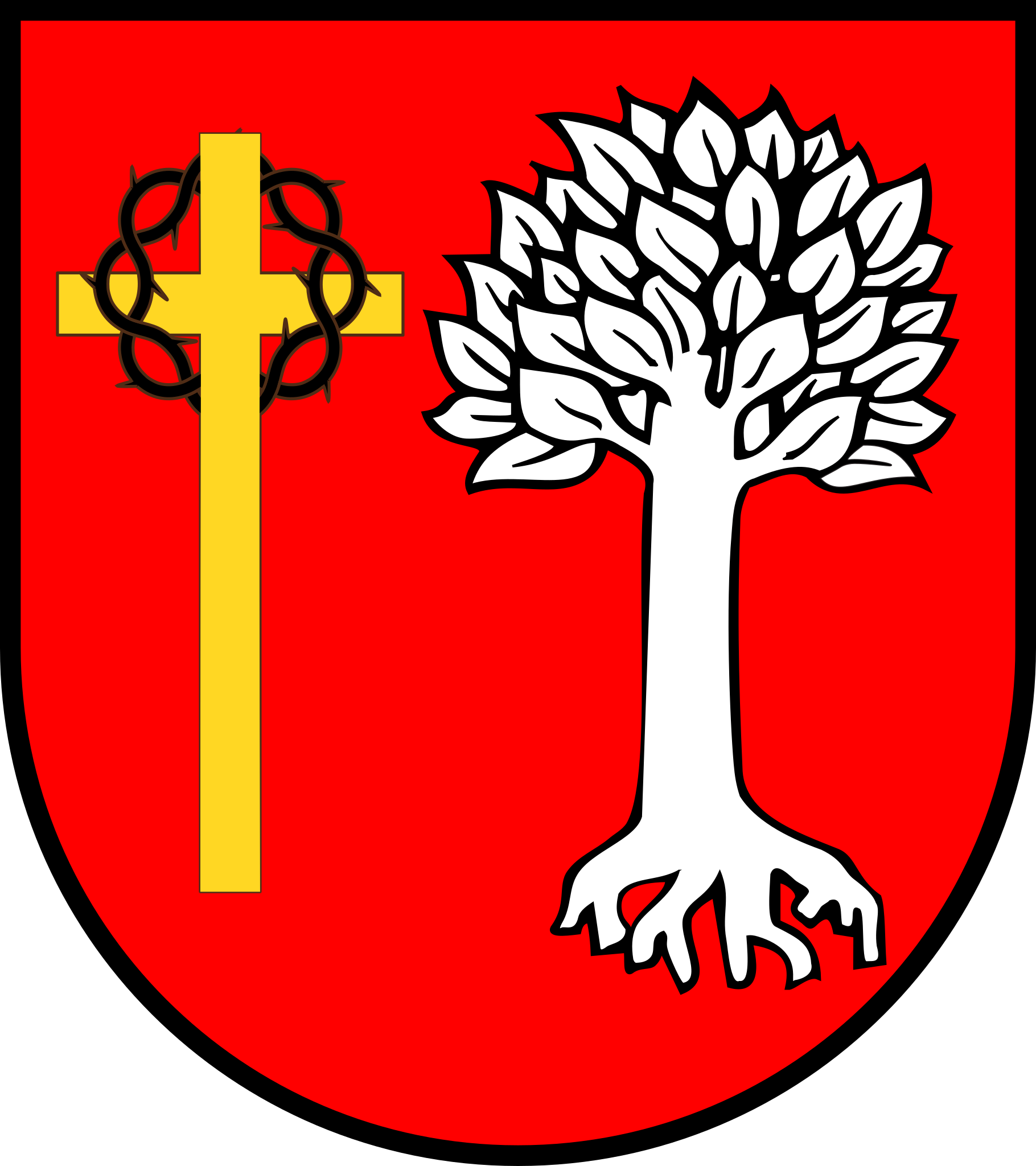 Amtswappen des Entlebuch im 16. Jahrhundert (1479 bis mind 1580, Weiterverwendung wohl bis 1798, und inoffiziell bis heute). Zu Geschichte von Wappen und Banner vgl.: DOI:10.5169/seals-744690, home.datacomm.ch/joshuwiler zur Blasonierung: Kreuz meist in Gold, Dornenkrone in schwarz, die Buche hat meist einen Stamm in Silber, oft mit drei grossen Wurzeln, die Krone bzw. das Laub ist im Banner grün (im jüngeren Landesbanner von 1472 hellgrün), in den Wappenscheiben des 16. Jh. aber oft auch in Silber). Das moderne Gemeindewappen von Entlebuch orientiert sich in der Darstellung der Buche am älteren Landesbanner von 1382. |