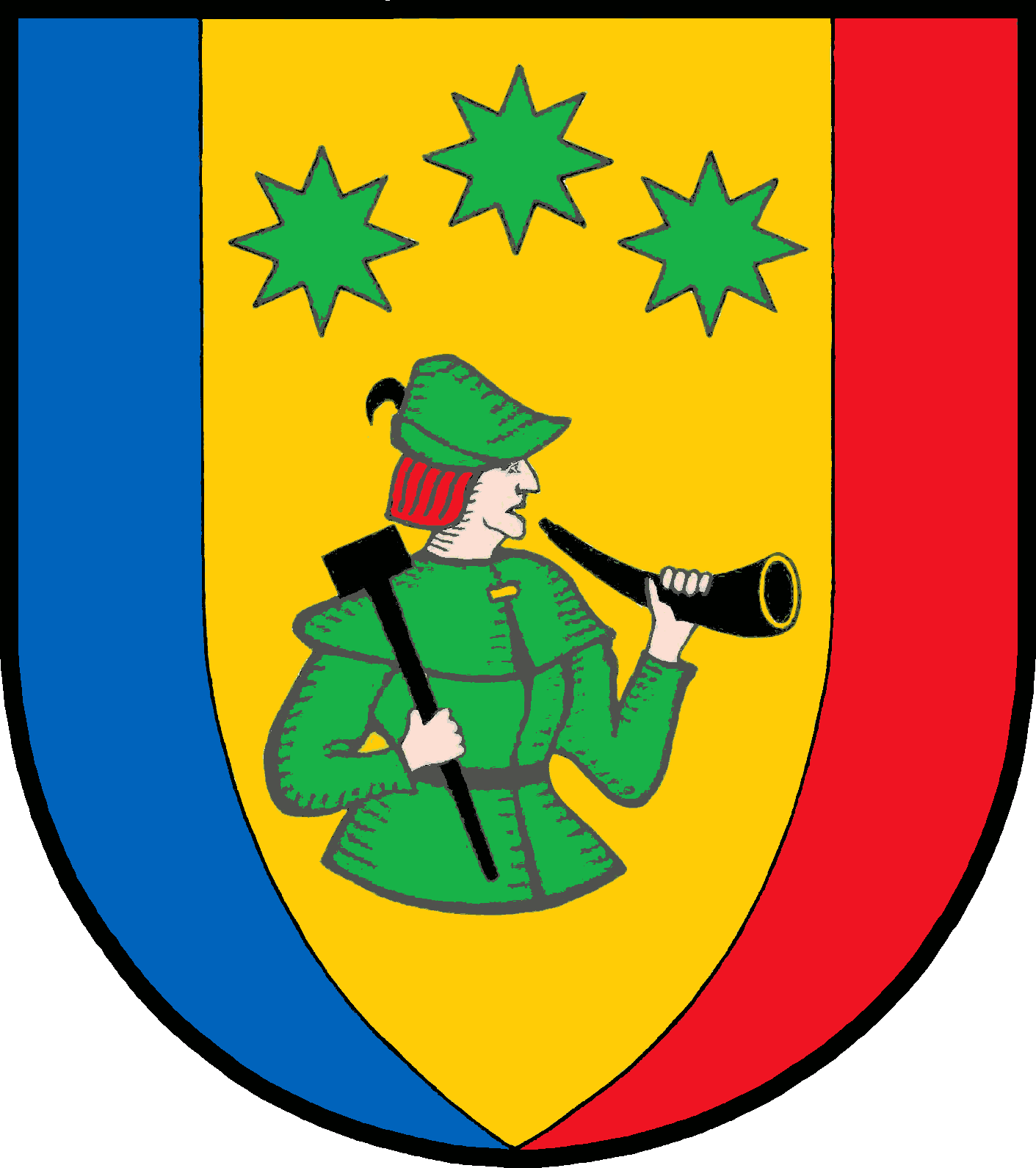 Deutsch: Wappen der Gemeinde Panten im Kreis Herzogtum Lauenburg, Schleswig-Holstein. Blasonierung: Von Blau und Rot gespalten durch eine schildförmige, gestürzte goldene Spitze, darin unter drei 1 : 2 gestellten, achtstrahligen grünen Sternen ein linksgewendeter, grün gekleideter halber Hirte, der in der Linken ein schwarzes Horn, in der Rechten einen schwarzen Holzhammer hält. |