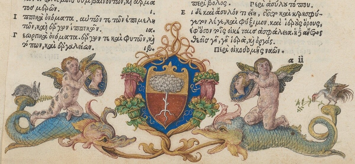 Deutsch: Wappen des Willibald Pirckheimer in einem Aldus-Manutius-Druck der Landesbibliothek Oldenburg (Polydeukes: "Onomastikon". Venedig: Aldus, 1502), womöglich von Albrecht Dürer |