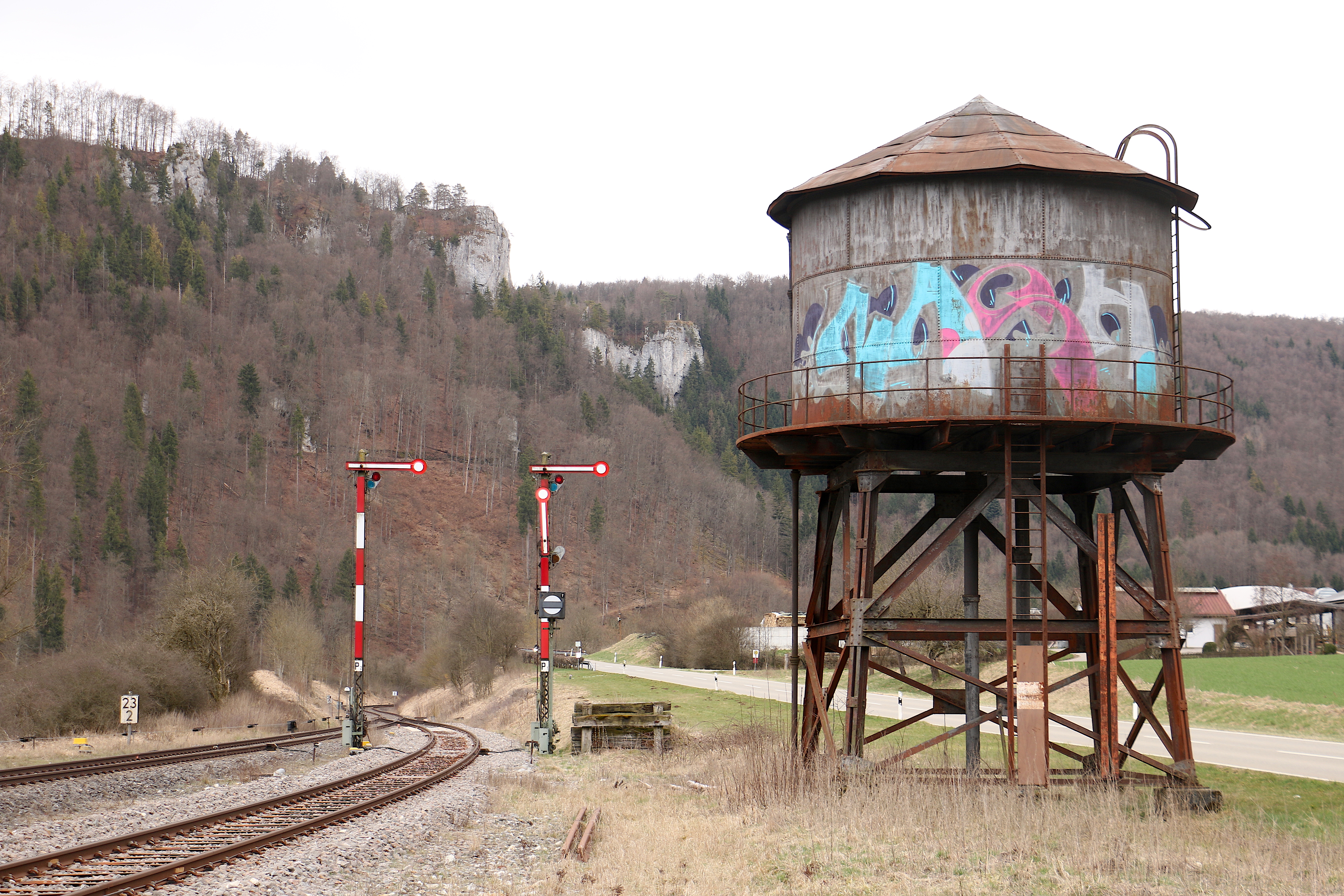 Deutsch: Wassertank und Ausfahrsignale in Hausen im Tal (2018)