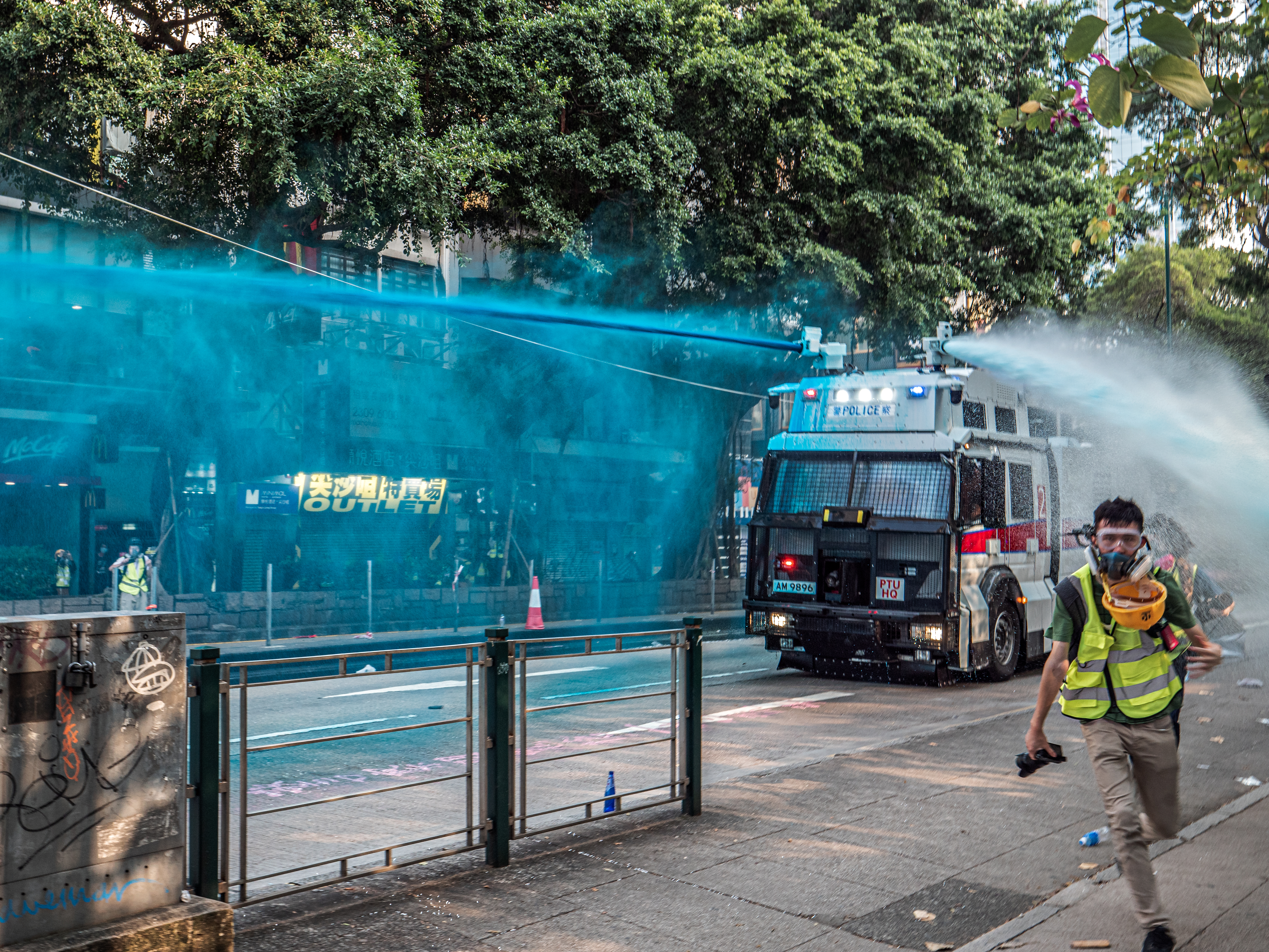 ملف:Water cannon in Hong Kong delivering water with blue pigment.jpg