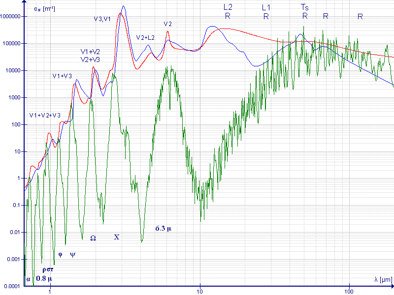 English: Water absorption spectrum. Absorption coefficient for water - liquid (red line), vapor (green) and ice (blue) between 667 nm and 200 μm (red and most important part of infrared). The graph was created using the Graph open source application. |