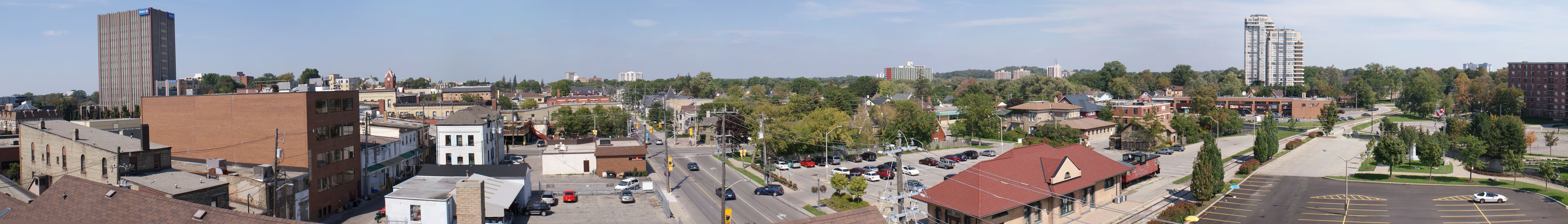 English: A 270­° Panorama of Waterloo, Ontario taken from the North East corner of the Uptown Parkade. This image is made up of 15 Photos taken at: 28mm, 1/160sec, ISO-100, f11.
