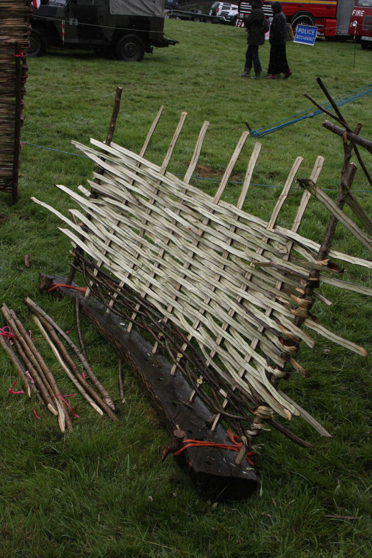 English: Wattle hurdle in the process of being made.