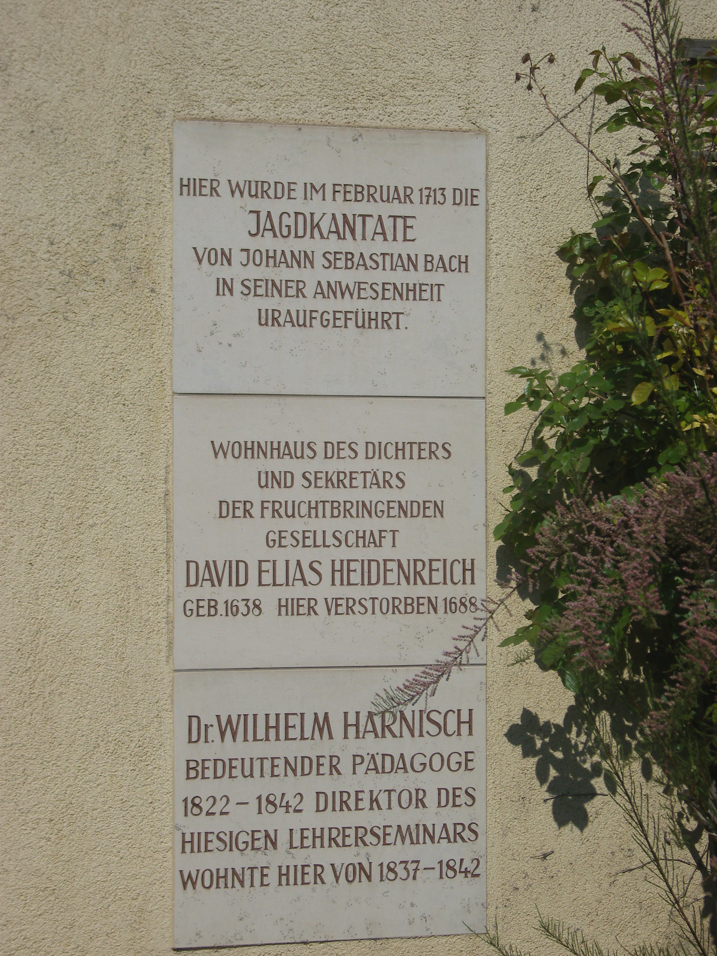 Deutsch: Gedenktafeln am Jägerhof in Weißenfels; Gedenktafeln an die Uraufführung der Jagdkantate von Johann Sebastian Bach; an David Elias Heidenreich und an den Pädagogen Wilhelm Harnisch |