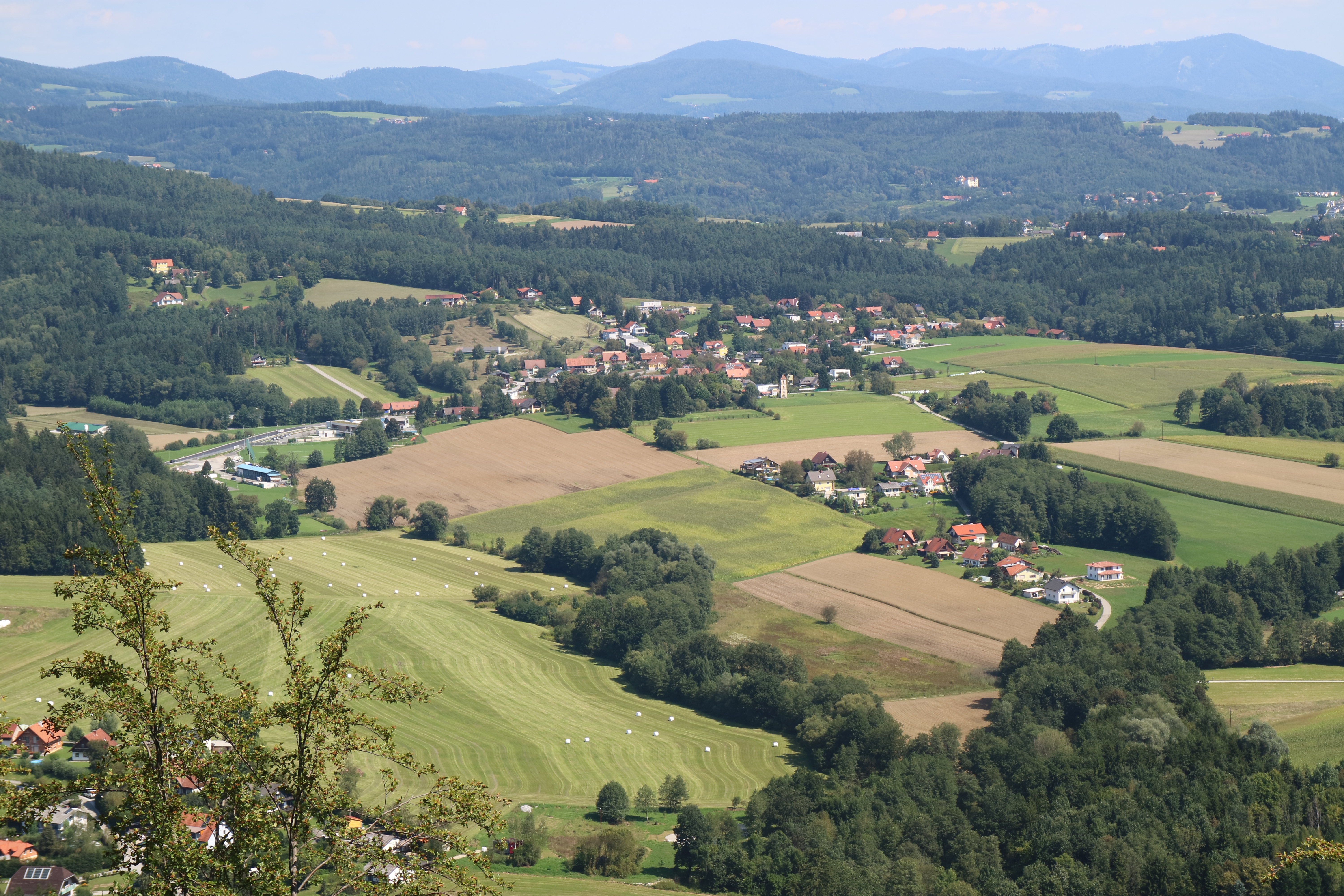 Deutsch: Blick vom Hauenstein nach Nordosten auf die Ortschaft Niederschöckel und über die Gemeinde Weinitzen (Steiermark) |