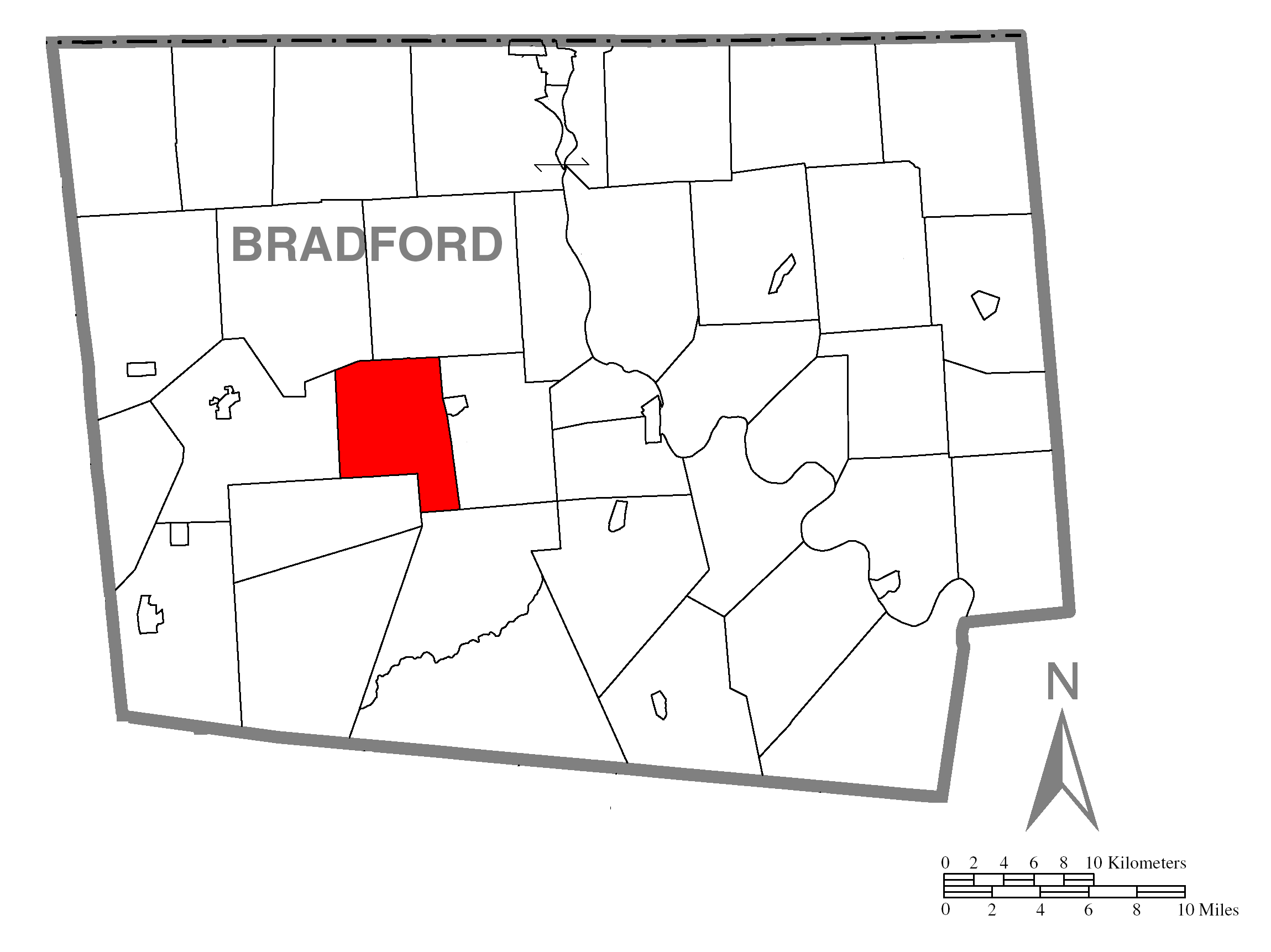 Map of Bradford County, Pennsylvania, United States with township and municipal boundaries highlighting West Burlington Township is taken from US Census website[1] and modified by Ruhrfisch in April 2006 and Dincher in February 2008. Our modifications licensed under the GNU Free Documentation License.