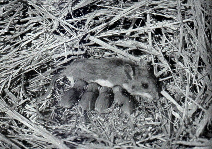 English: The original caption is: "White-footed mouse and young - by AA.R. dugmore. Mr. Dugmore ran a mile to restore the mother to her children, she having run into his pocket when frightened, and being found there later. courtesy of Doubleday, Page & Co.