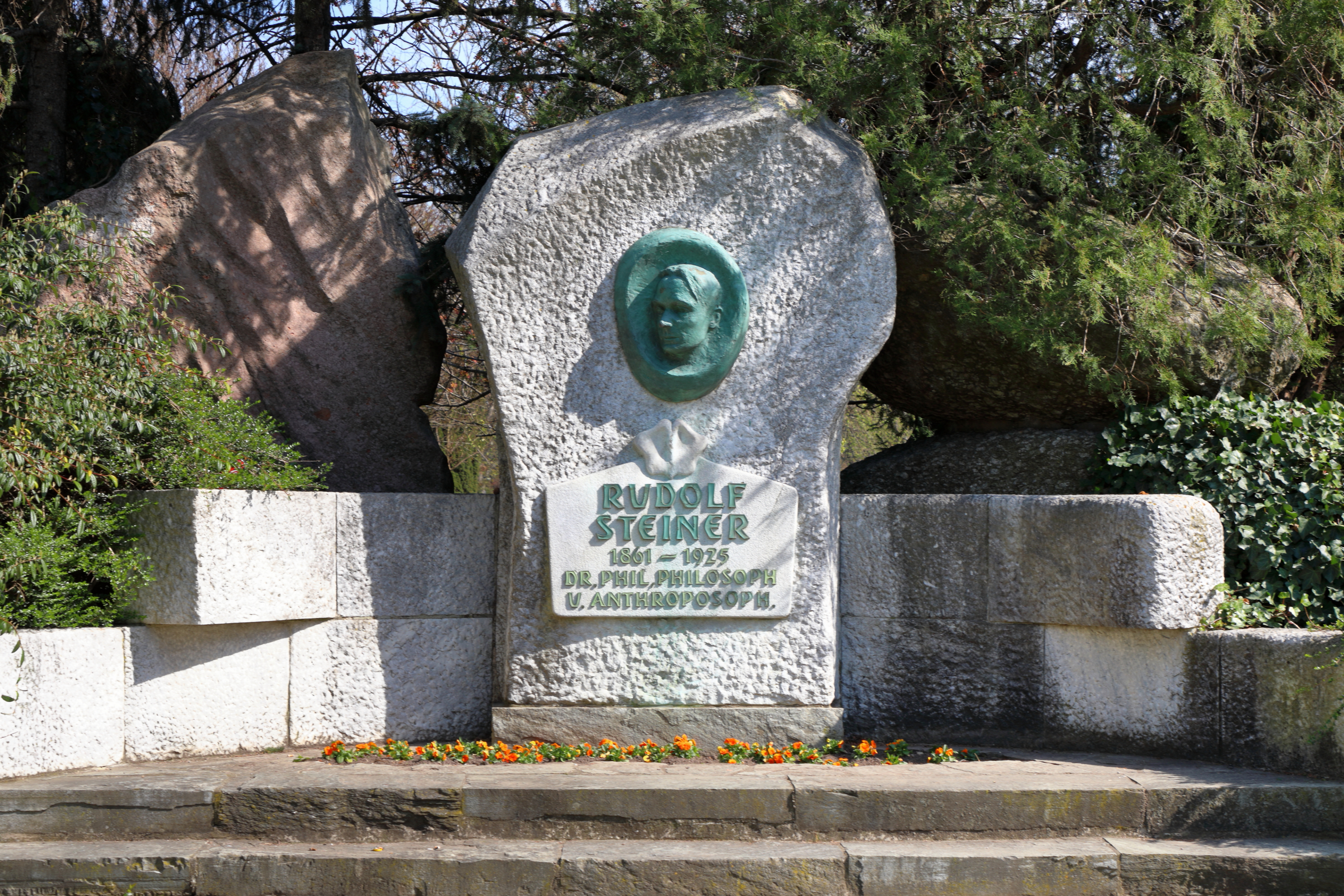Deutsch: Das Rudolf-Steiner-Denkmal im Schweizergarten im 3. Wiener Gemeindebezirk. Die Gedenkstätte zu Ehren von Rudolf Steiner (1861–1925) wurde im Jahr 1981 nach einem Entwurf von Michael Georg und auf Initiative des Rudolf-Steiner-Gedenkstättenkomitees geschaffen, wobei das Bronzerelief die Künstlerin Elisabeth Oling-Jellinek (1915–2007) schuf: [1], File:Rudolf Steiner-IMG 7662.JPG. Nachdem das Denkmal 2014 geschändet und mutwillig beschädigt wurde, erfolgte im Jahr 2015 eine Restaurierung. Dabei wurden wegen den grassierenden Bundmetalldieben die Bronzeteile durch Kunststoffteile ersetzt, die jedoch schnell verwitterten: [2]. |