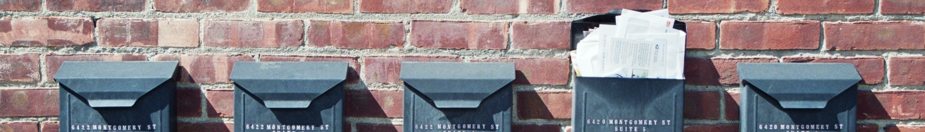 English: Five mail boxes, all in a row: 6422 Montgomery Street, Suites 1,2,3,4,5 |
