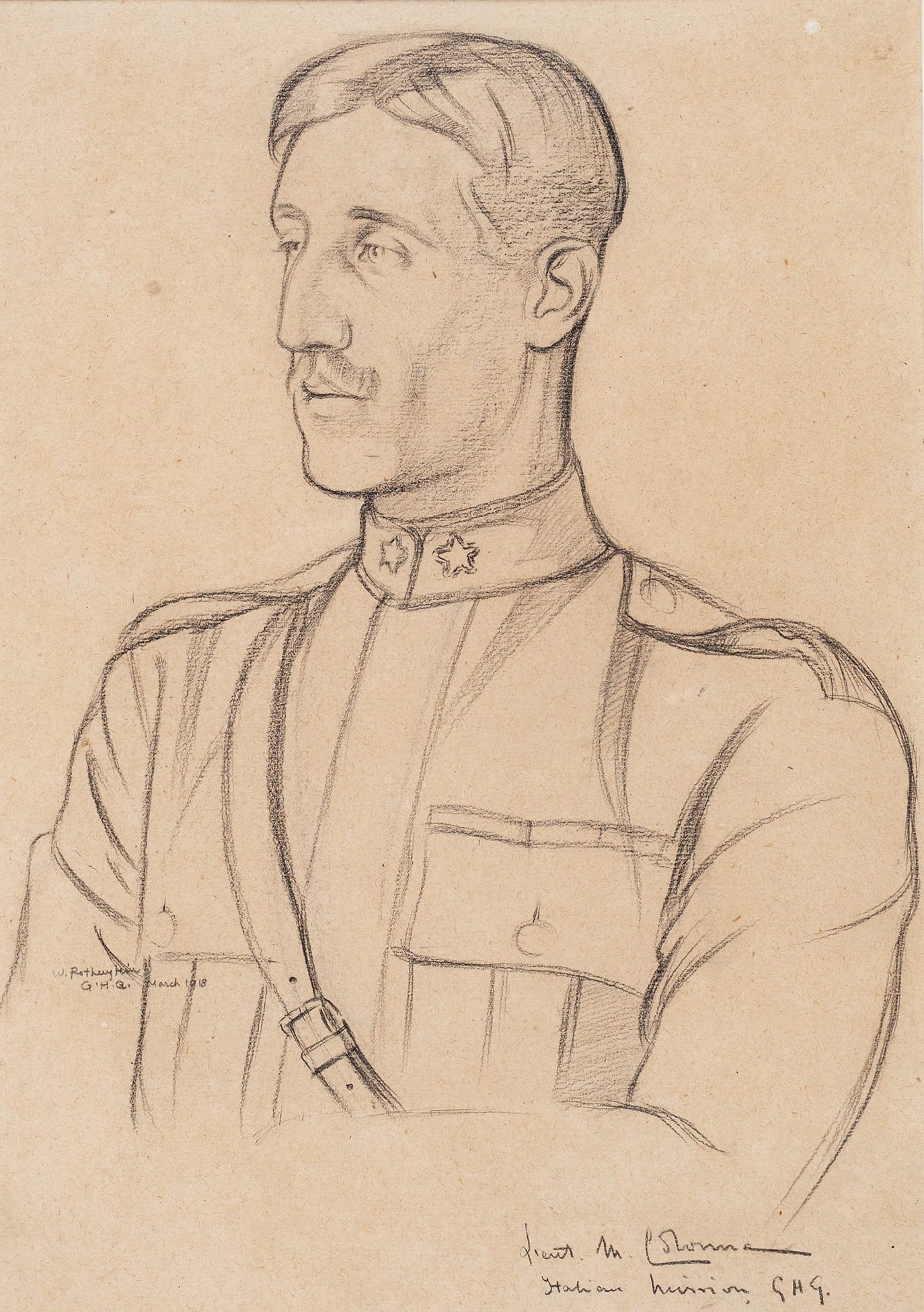 English: Offered for sale by Abbott and Holder in April 2020 when it was described as "‘Lieutenant M. Colonna’; Mario, Prince of Colonna and Duke of Rignano (1886-1938). Chalk. Signed, inscribed ‘G.H.Q. / Italian Mission’ and dated, March 1918. 17.5x12.5 inches.' |
