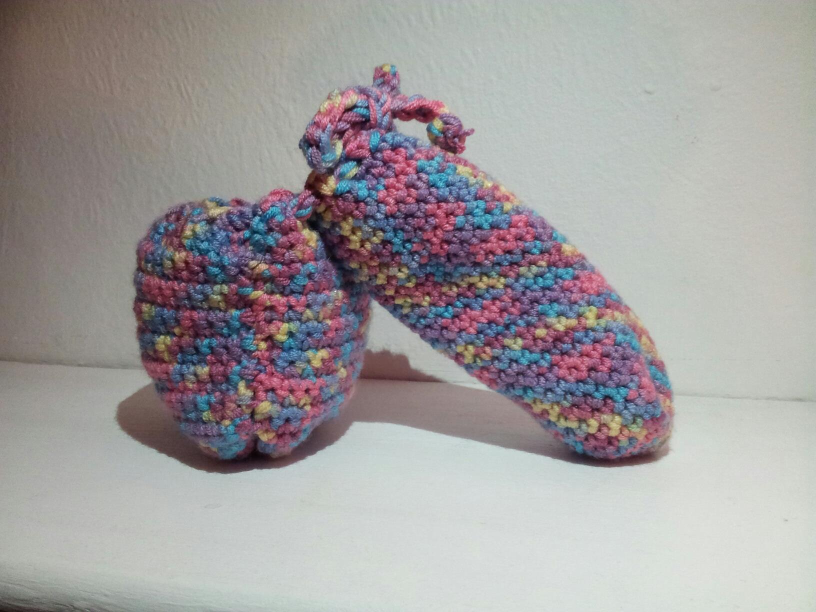 English: Hand-crocheted penis warmer/"cock sock"/ willy warmer made from multicoloured yarn with drawstring. Crocheted 1st April 2013 by K. Dighton. |