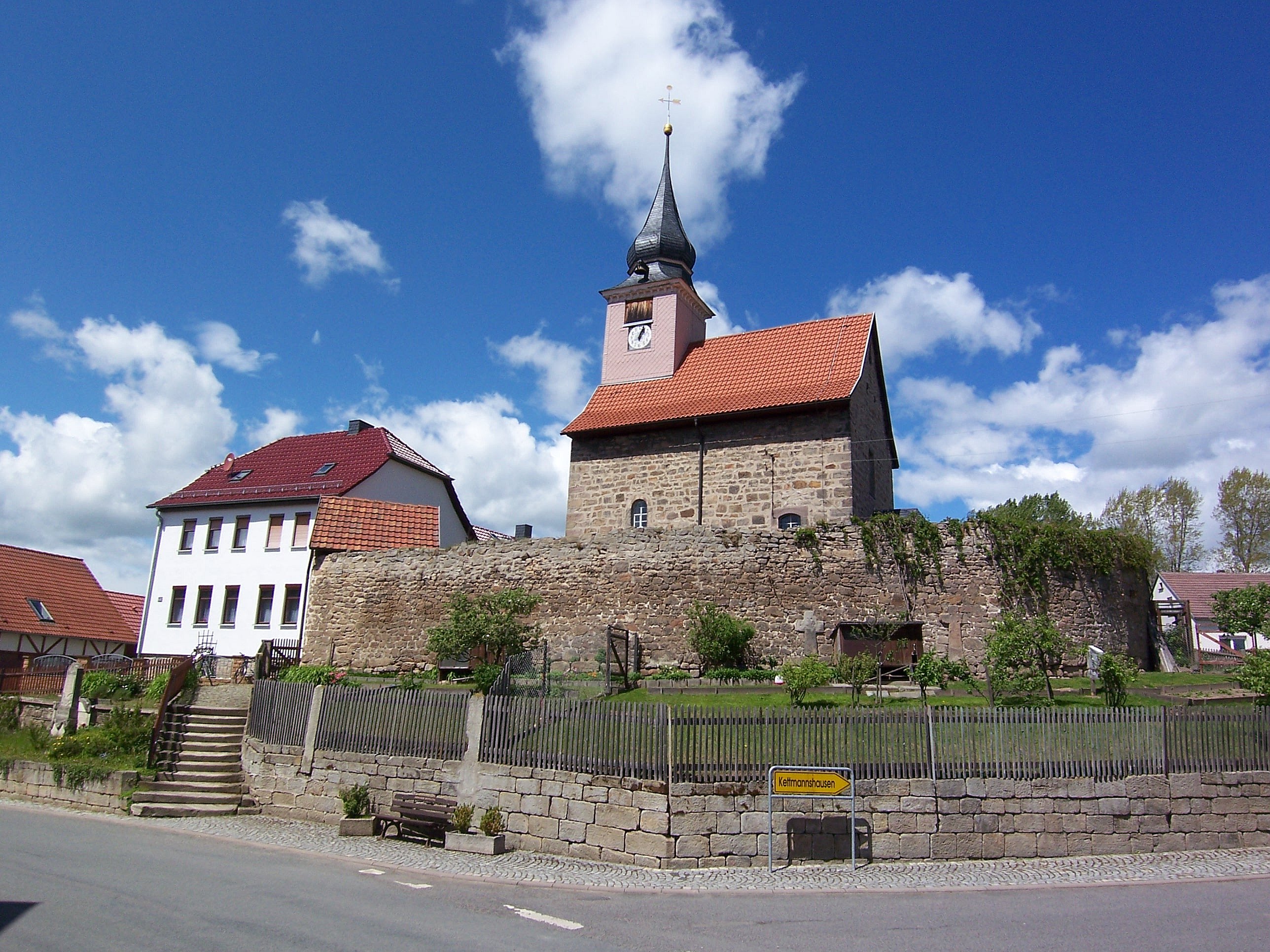 Deutsch: Kirchenburg in Wipfra mit Steinkreuzen |