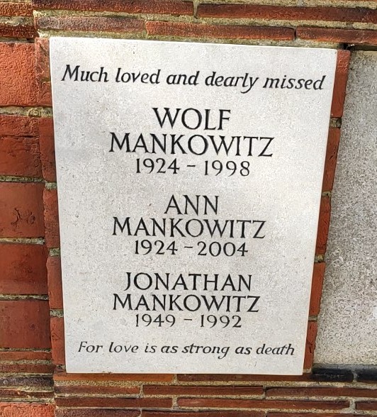 English: Commemorative plaque dedicated to Wolf Mankowitz at Golders Green Crematorium |
