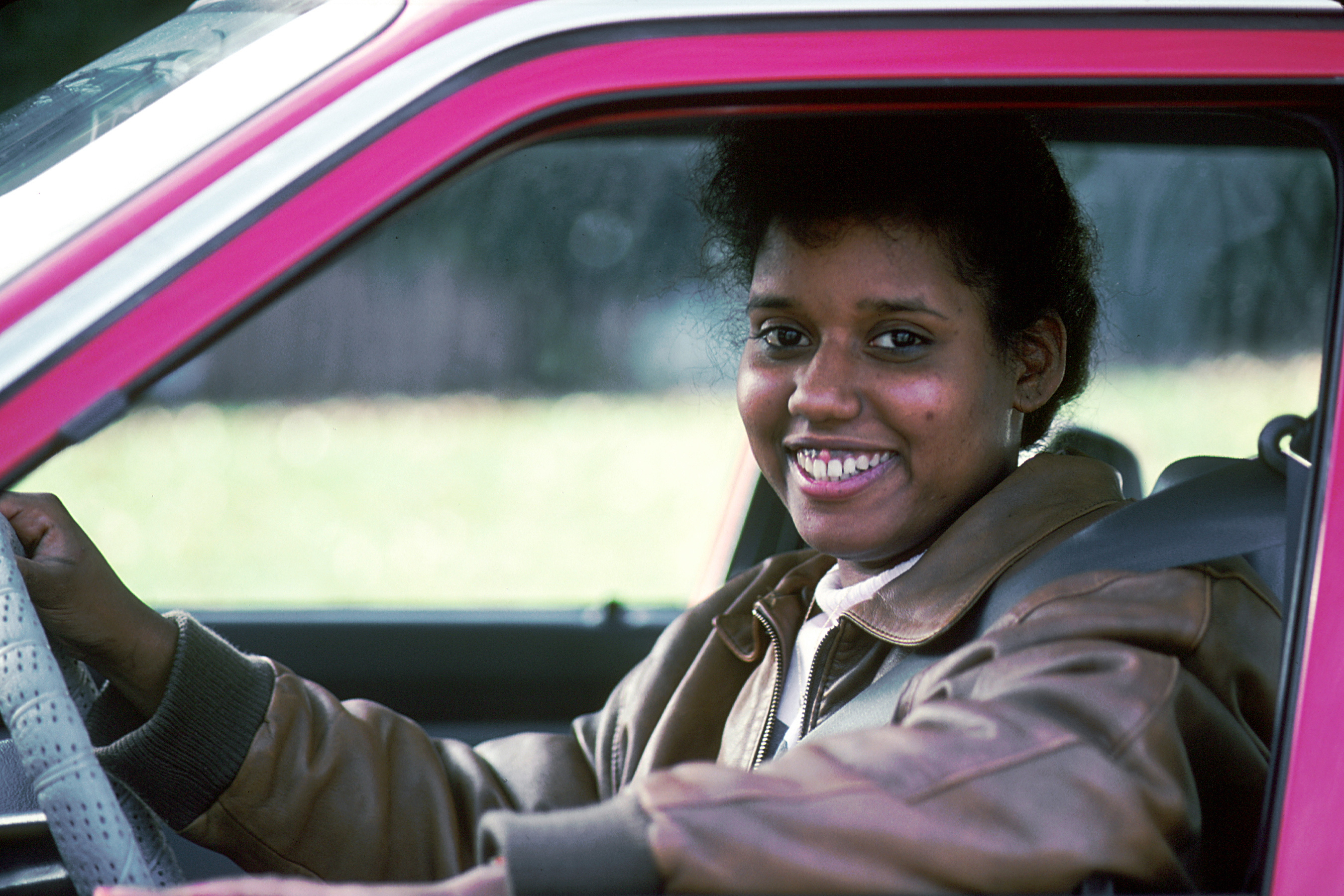 ملف:Woman smiles while driving.jpg