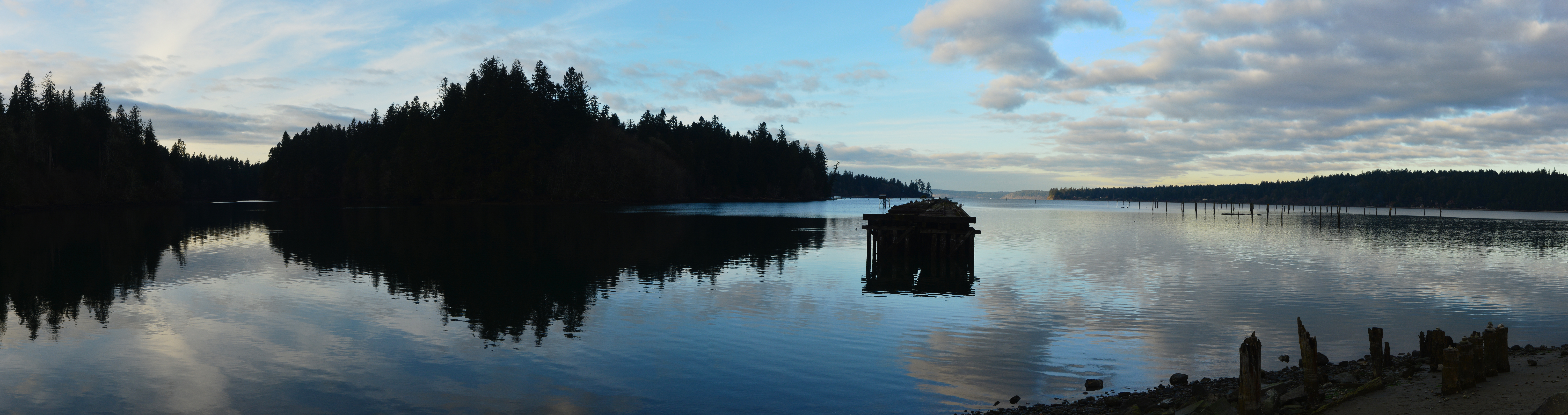 English: Panoramic view of Chapman Bay on Henderson Inlet, from Woodard Bay Natural Resources Conservation Area, Thurston County, Washington, U.S.