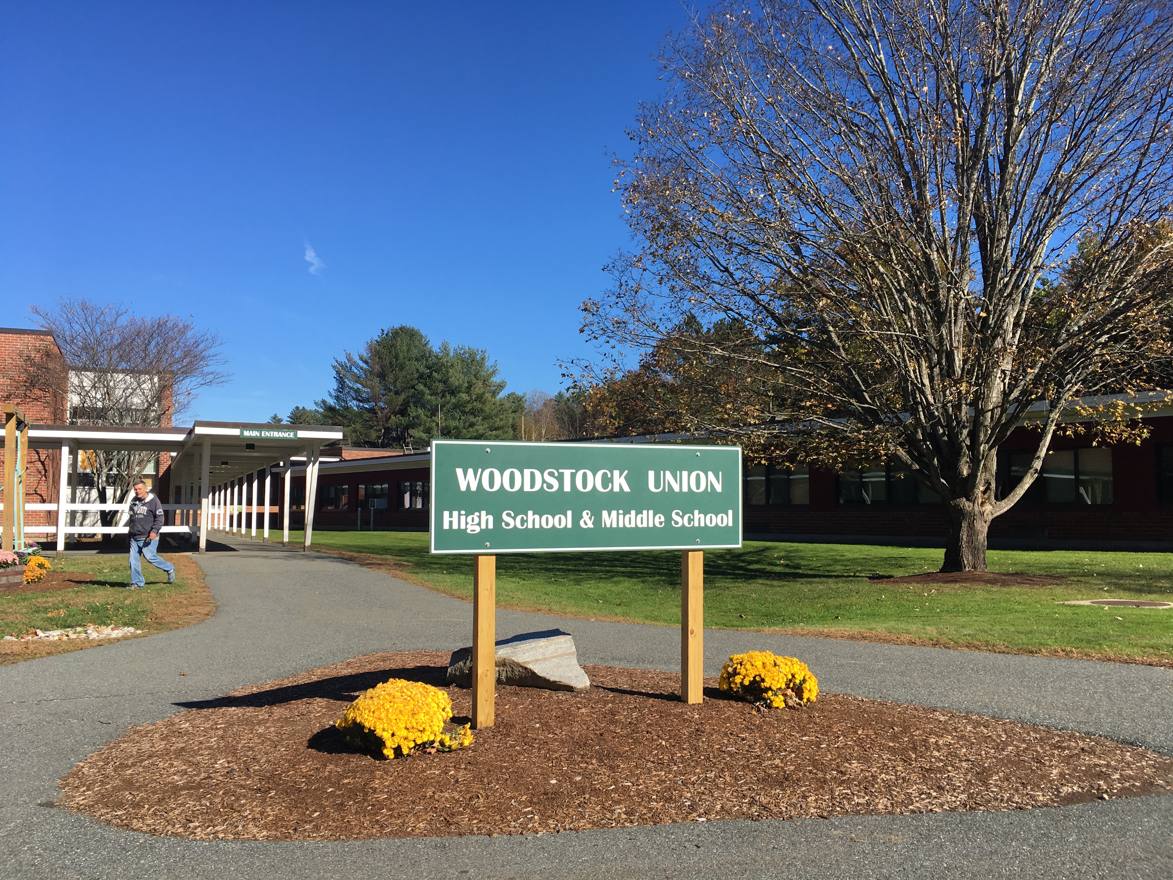 English: The main entrance to the school, located in Woodstock, Vermont, as seen on October 26, 2018. |