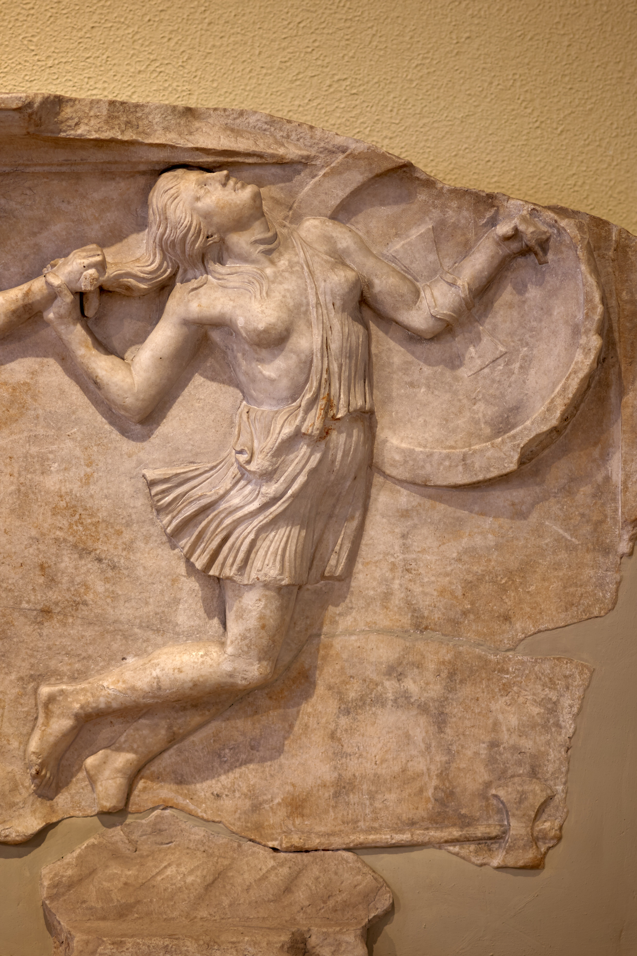 English: Detail from a relief depicting a Greek warrior pursuing an Amazon. Piraeus, Archaeological Museum (1-6-2020). |