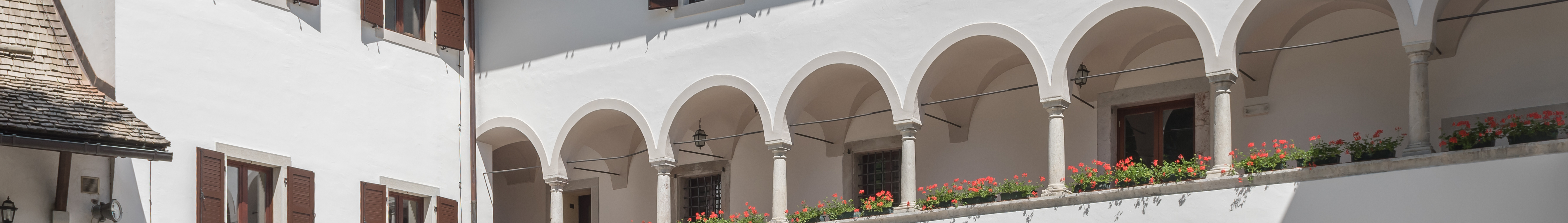 English: Arcade yard of the Venetian Palace, municipality Malborghetto in Val Canale, region Friuli-Venezia Giulia, Italy, EU