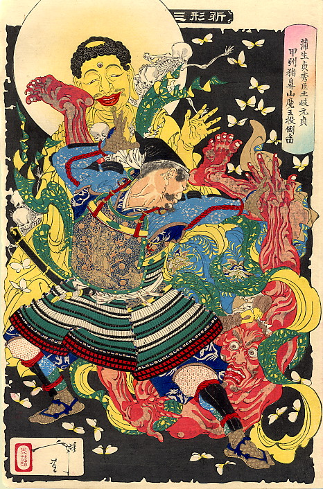 Tsukioka Yoshitoshi, Hurling a Demon King, January 1890. From the Thirty-six Ghosts series. 9.25" x 14.25". The print depicts Toki Motosada, the servant of Gamo Sadahide, throwing a demon king to the ground at Mount Inohana. From here.