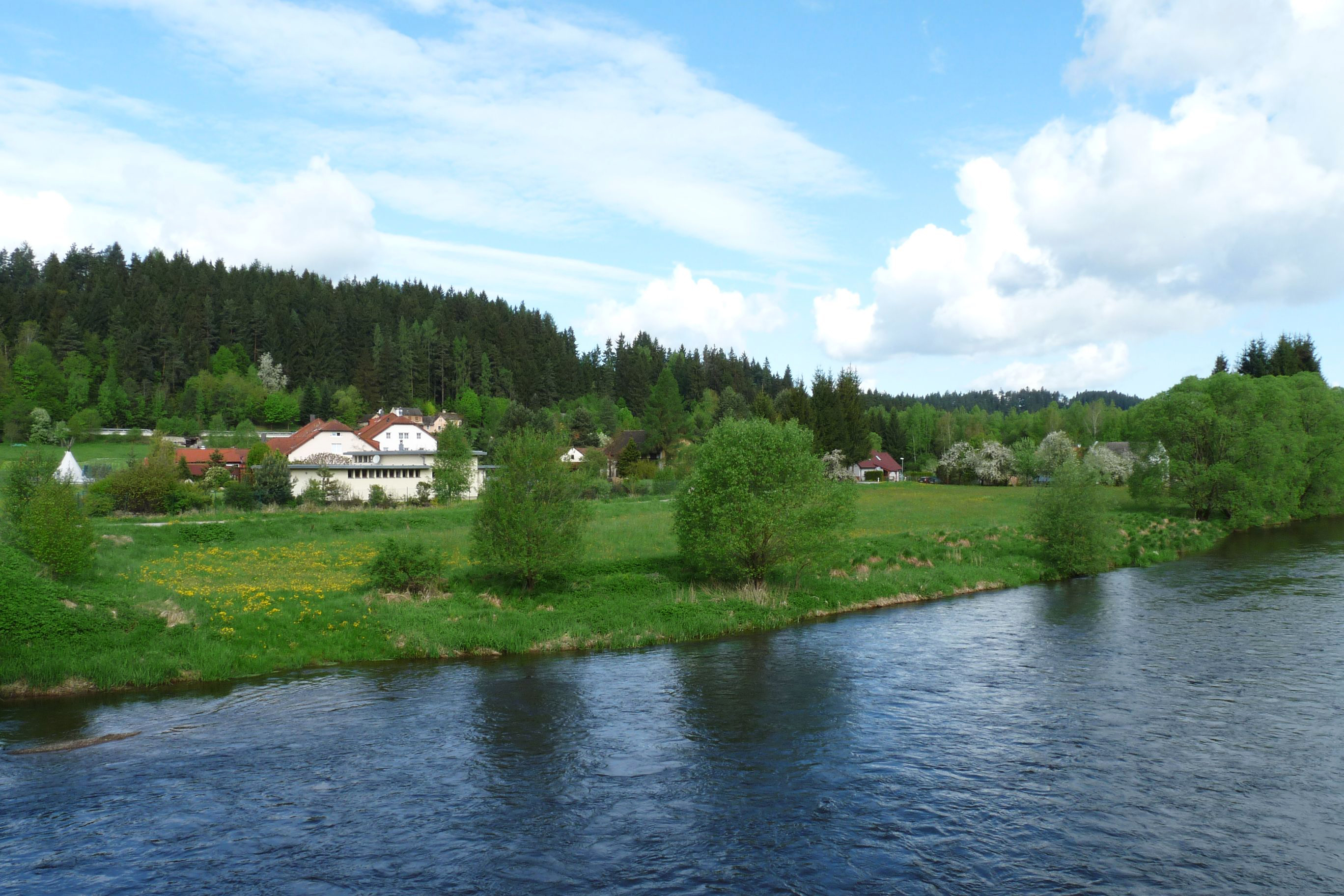 (بالتشيكية) English: Village of Zátoňské Dvory, Český Krumlov District, South Bohemian Region, Czech Republic as seen across the Vltava River. |