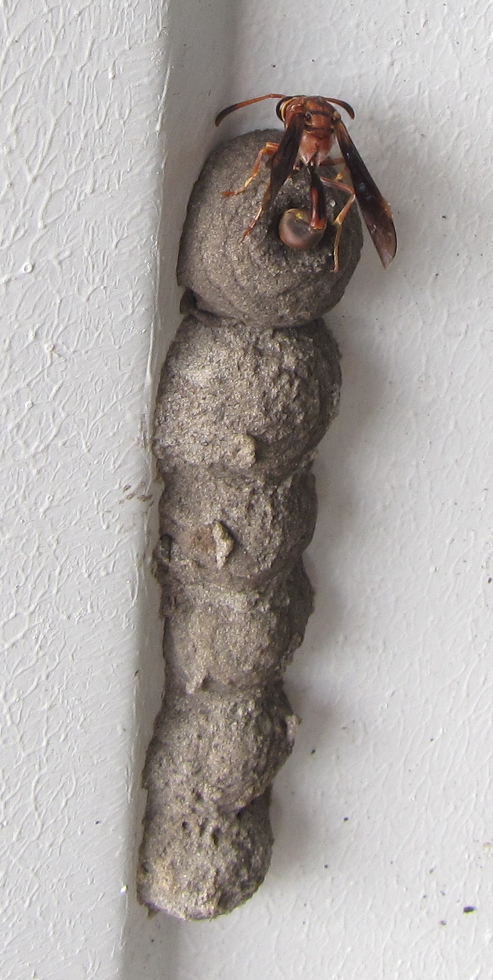 English: Zeta argillaceum - Potter Wasp, Dunedin, FL, USA. This wasp constructed a series of nests on the side of a metal-sided building. |