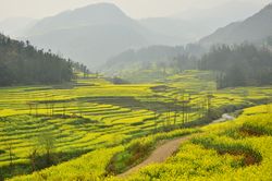 East of the Tibetan Plateau, deeply folded mountains fan out toward the Sichuan Basin, which is ringed by mountains with 1,000–3,000 m elevation. The floor of the basin has an average elevation of 500 m and is home to one of the most densely farmed and populated regions of China. The Sichuan Basin is capped in the north by the eastward continuation of the Kunlun range, the Qinling, and the Dabashan. The Qinling and Dabashan ranges form a major north-south divide across China Proper, the traditional core area of China. Southeast of the Tibetan Plateau and south of the Sichuan Basin is the Yunnan-Guizhou Plateau, which occupies much of southwest China. This plateau, with an average elevation of 2,000 m, is known for its limestone karst landscape.