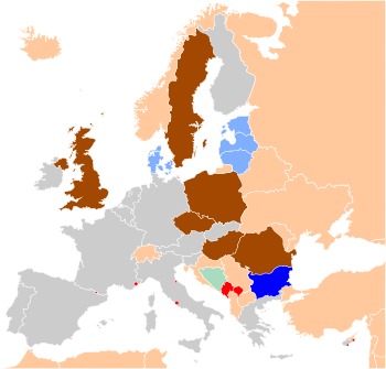 The remaining six countries are obliged to adopt the euro in future, although the EU has so far not tried to enforce any time plan. They should join as soon as they fulfill the convergence criteria, which include being part of ERM II for two years. Sweden, which joined the EU in 1995 after the Maastricht Treaty was signed, is required to join the eurozone. However, the Swedish people turned down euro adoption in a 2003 referendum and since then the country has intentionally avoided fulfilling the adoption requirements by not joining ERM II, which is voluntary.[36][37] Bulgaria joined ERM II on 10 July 2020.[38]